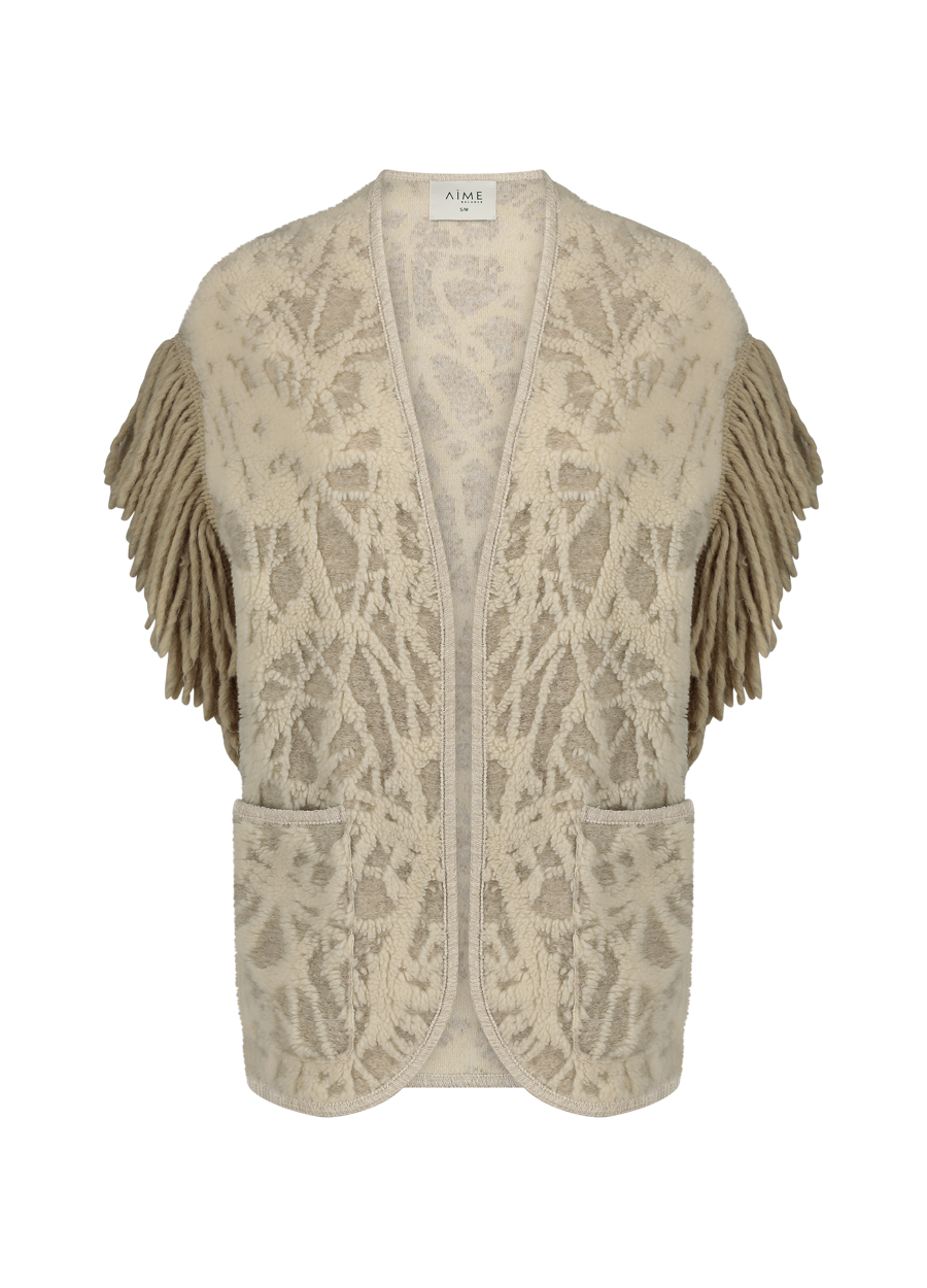 Maak een statement met de Elia Gilet in Crème! Dit unieke gilet, gemaakt van luxe wol burned out teddy, combineert warmte met stijl in één opvallend kledingstuk. Het crèmekleurige patroon en de rijke textuur van de stof maken dit gilet een must-have voor de modebewuste vrouw.