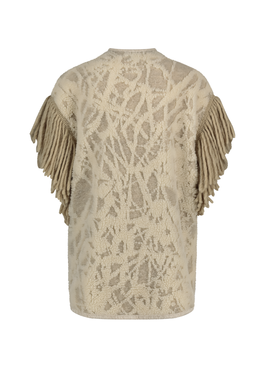 De Elia Gilet valt op door zijn speelse franjes aan de schouders en de diepe zakken aan de voorkant, die zowel stijl als functionaliteit toevoegen. Het open ontwerp maakt dit gilet perfect voor laagjes, zodat je het gemakkelijk kunt dragen over een blouse, trui of zelfs een jurk. De combinatie van luxe wol en het unieke teddy-materiaal zorgt voor een ongeëvenaarde mix van comfort en stijl.