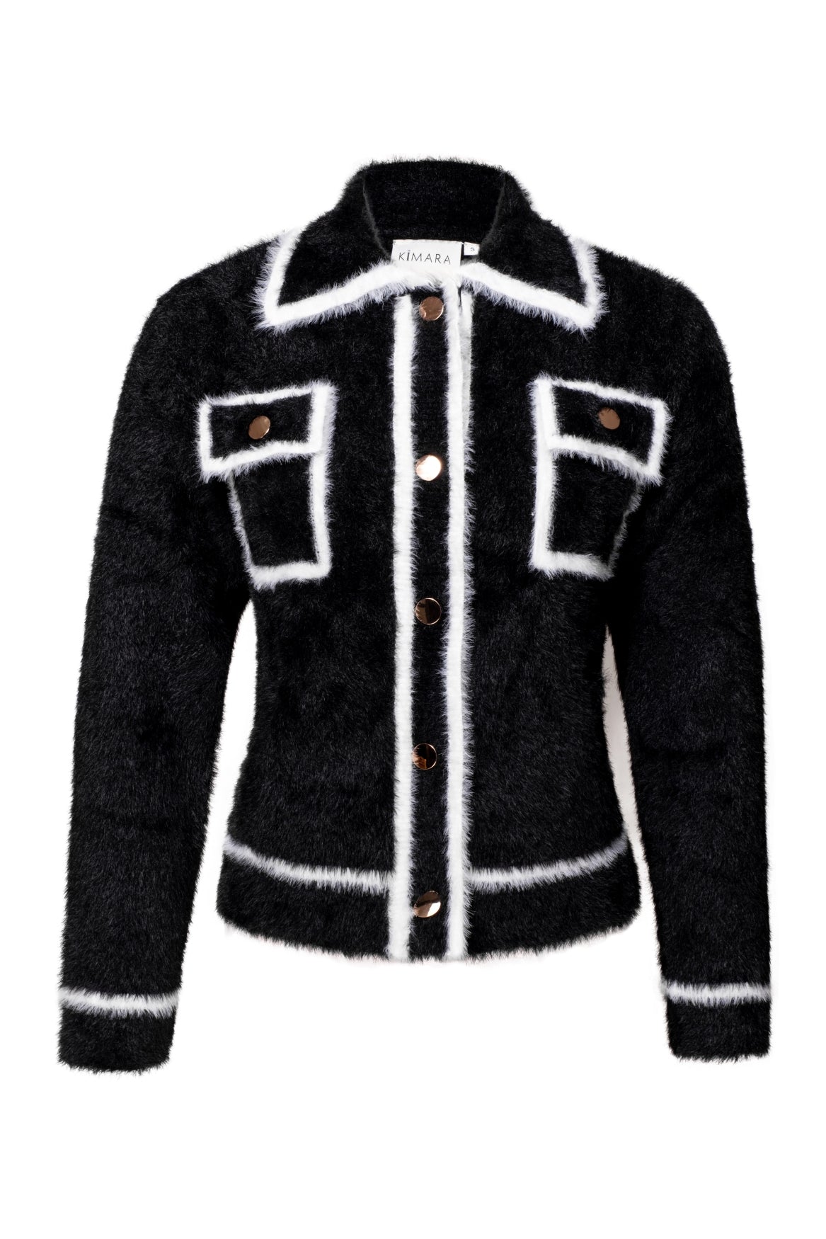 Waarom je de Noel Cardigan wilt hebben:- Zwarte fuzzy stof met elegante witte contrastbiezen