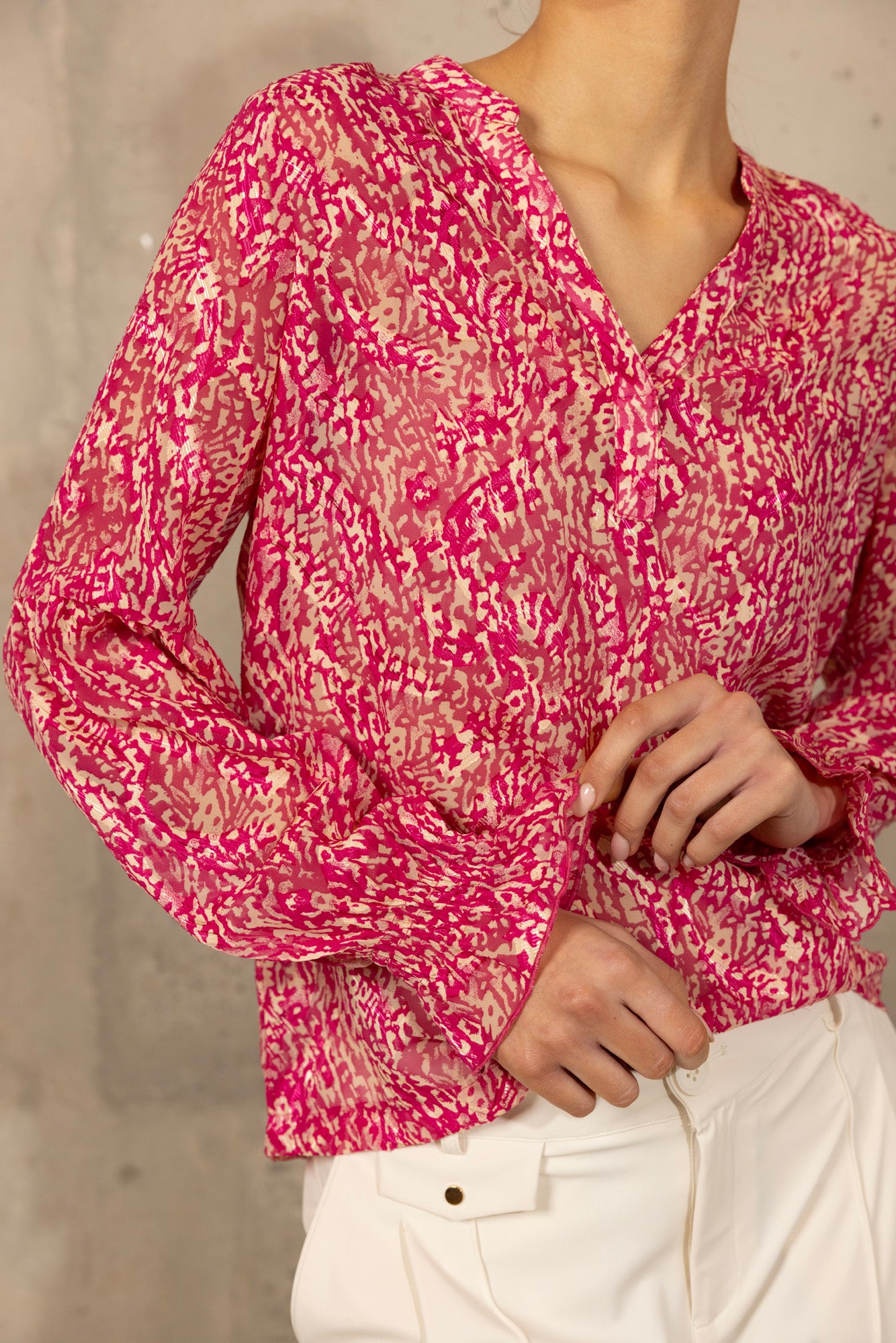 Maak kennis met de Thesa Blouse in Cosmos Pink, een verbluffend kledingstuk gemaakt van luxueuze chiffon. Deze blouse heeft een levendig roze patroon dat elegantie en verfijning uitstraalt, perfect voor zowel casual als formele gelegenheden. De lichte chiffon stof zorgt voor comfort en ademend vermogen, terwijl het stijlvolle ontwerp een vleugje glamour toevoegt aan elke outfit. Combineer het met je favoriete jeans of een chique rok voor een moeiteloos modieuze look. Verhoog je garderobe met de Thesa Blouse in Cosmos Pink vandaag nog!