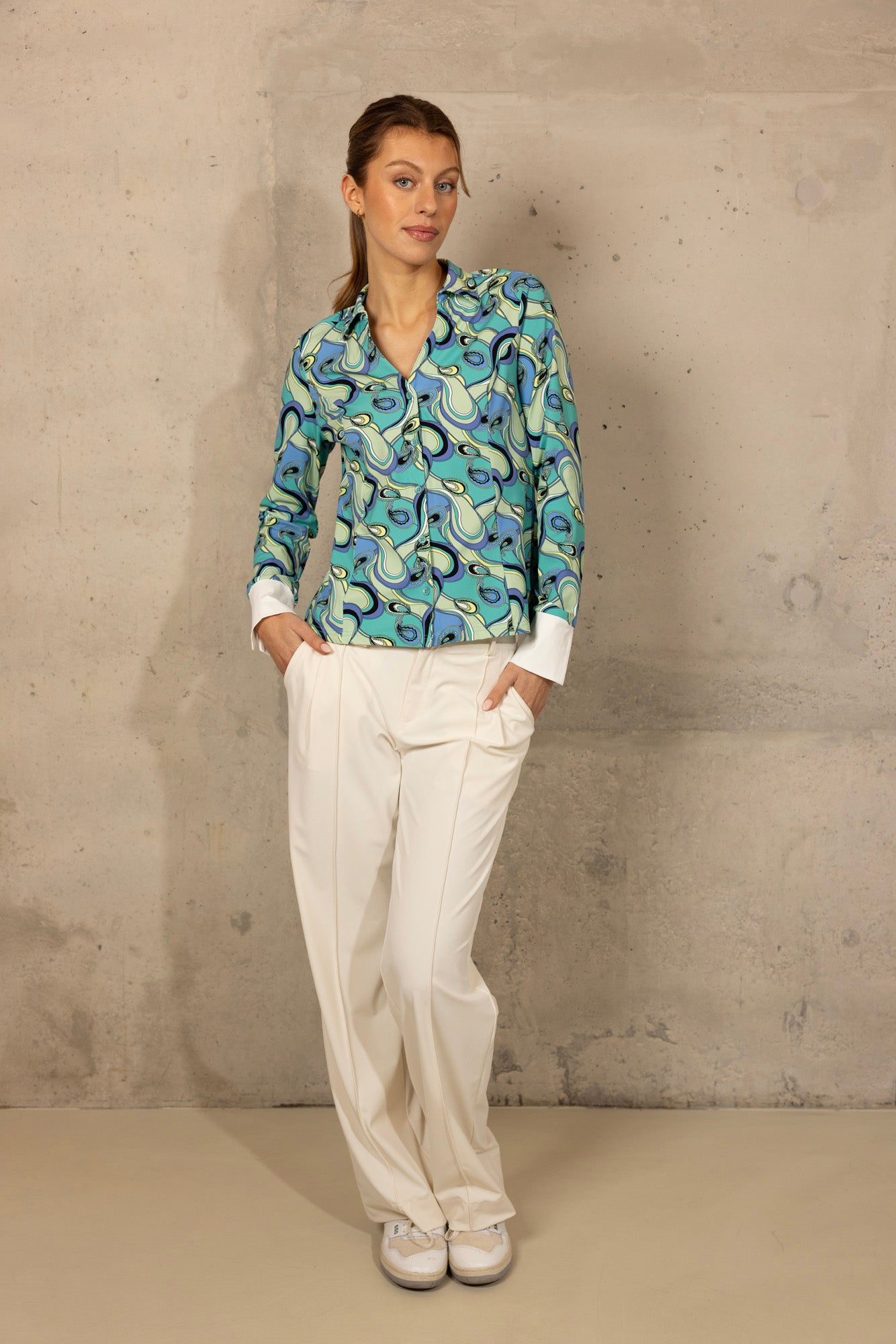 Maak kennis met de Yen Blouse, een opvallend kledingstuk gemaakt van hoogwaardige travelstof met de levendige Disco Fever print. Deze blouse heeft een kleurrijk, wervelend patroon in tinten blauw, groen en zwart, wat zorgt voor een moderne en stijlvolle uitstraling. De manchetten zijn nu ook in de Disco Fever print, wat zorgt voor een samenhangend en modieus geheel. Perfect voor zowel casual als formele gelegenheden.