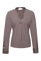 De Kara Blouse is een elegante blouse met een edgy twist. De V-hals is afgewerkt met een subtiele leatherlook bies die doorloopt langs de voorzijde, wat zorgt voor een verfijnde en moderne uitstraling. Ook de manchetten zijn voorzien van dezelfde stijlvolle afwerking met knoopdetail – een subtiel accent dat het geheel net dat beetje extra geeft.