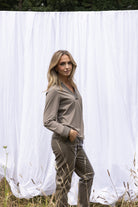 Model Veerle is 1.73 m, draagt normaal maat S en draagt hier maat S van Kimara. De blouse valt op maat en voelt zacht en soepel aan op de huid.