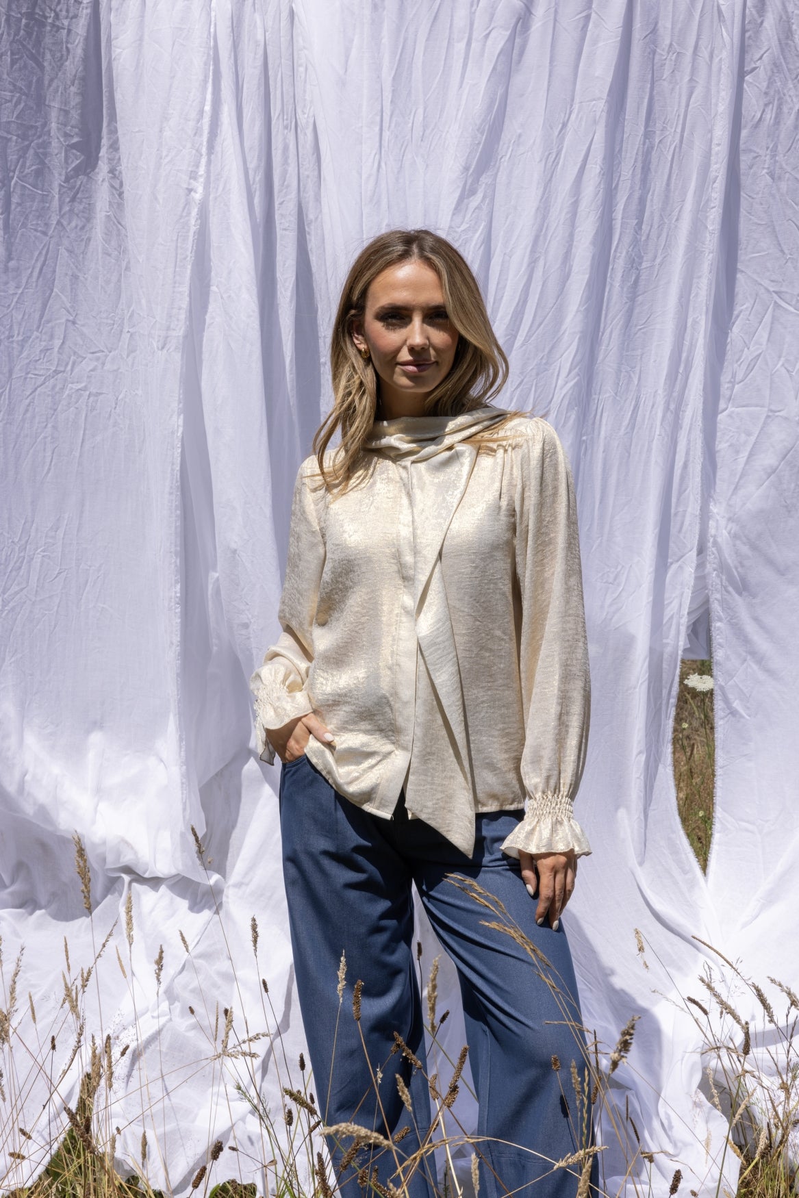 De Alice Blouse is een verfijnde toevoeging aan je garderobe, gemaakt van luxueus chiffon dat soepel en licht langs het lichaam valt. De blouse heeft een vrouwelijke uitstraling dankzij de strik bij de hals, die je zowel los als gestrikt kunt dragen – voor een speelse of juist klassieke look. De lange mouwen met subtiele ruffle cuffs geven een romantische touch aan dit elegante ontwerp.