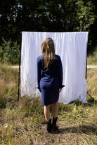 Model Veerle is 1.73 m, draagt normaal maat S en draagt hier maat S van Kimara. De jurk valt op maat en voelt soepel en luchtig aan op de huid.