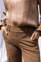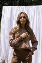 Model Veerle is 1.73 m, draagt normaal maat S en draagt hier maat S van Kimara. De blouse valt op maat en voelt soepel en licht aan.