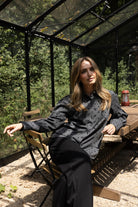 Model Veerle is 1.73 m, draagt normaal maat S en draagt hier maat S van Kimara. De blouse valt op maat en voelt licht en soepel aan.