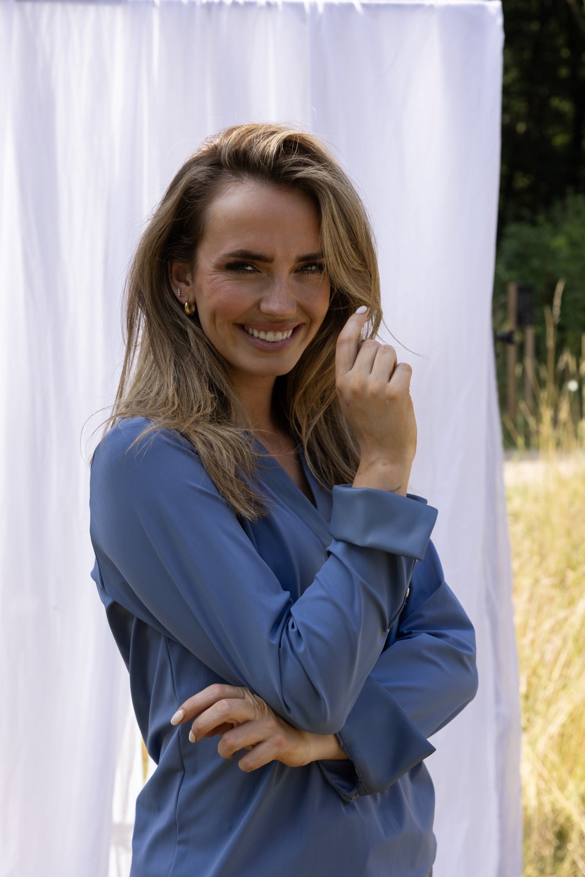 Model Veerle is 1.73 m, draagt normaal maat S en draagt hier maat S van Kimara. De blouse valt op maat en voelt zacht en soepel aan op de huid.