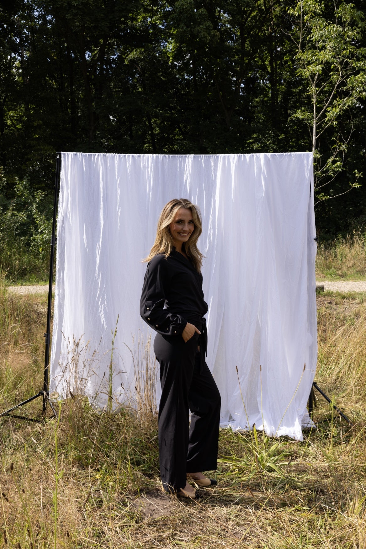 Model Veerle is 1.73 m, draagt normaal maat S en draagt hier maat S van Kimara. De broek valt op maat en beweegt comfortabel met je mee.