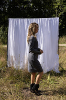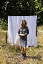Model Veerle is 1.73 m, draagt normaal maat S en draagt hier maat S van Kimara. De jurk valt op maat en voelt soepel en luchtig aan op de huid.
