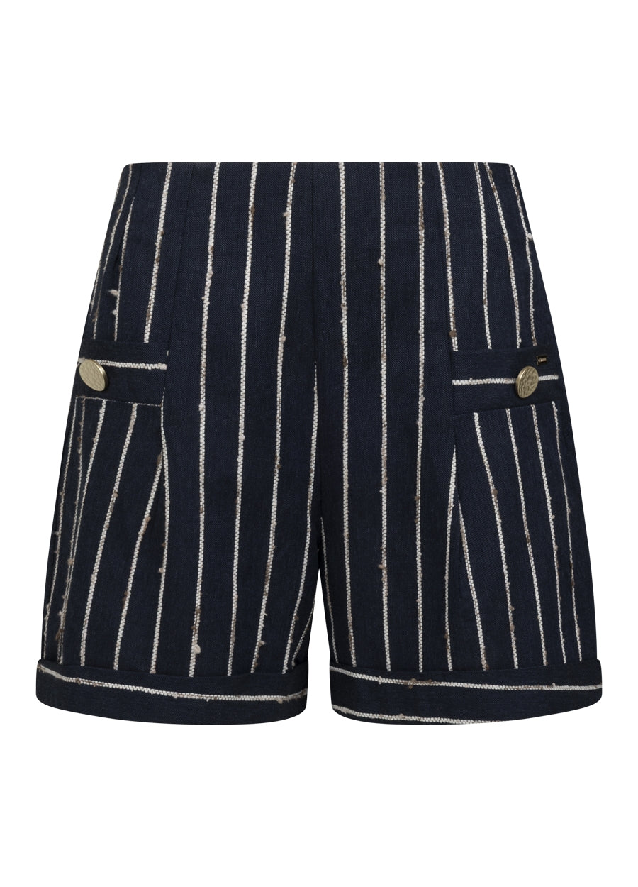 Het ontwerp valt op door de verticale krijtstreep, die de short een tijdloze en toch trendy look geeft. De gouden knoopdetails op de voorzakken brengen een vleugje elegantie in het geheel en versterken de luxere uitstraling. De omgeslagen zoom maakt het design modern en luchtig, perfect voor warmere dagen.