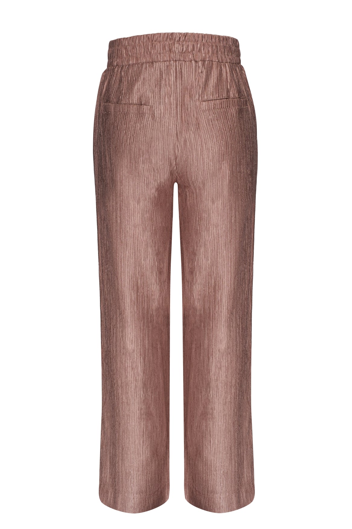 De broek heeft een comfortabele elastische tailleband, rechte pijpen en een moderne cropped lengte. Hierdoor valt de Thane Pants mooi langs het lichaam en creëert hij een rustig, clean silhouette met een luxe finish. De verticale structuur verlengt optisch en geeft de broek een zachte, stijlvolle valling.