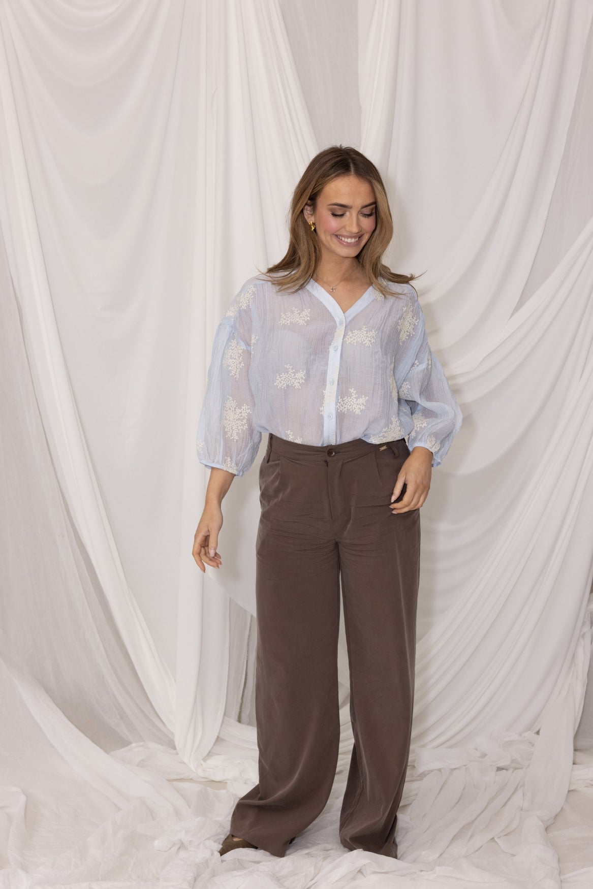 Model Veerle is 1.73 m, draagt normaal maat S en draagt hier maat S van Kimara. De blouse valt op maat en beweegt comfortabel met je mee.