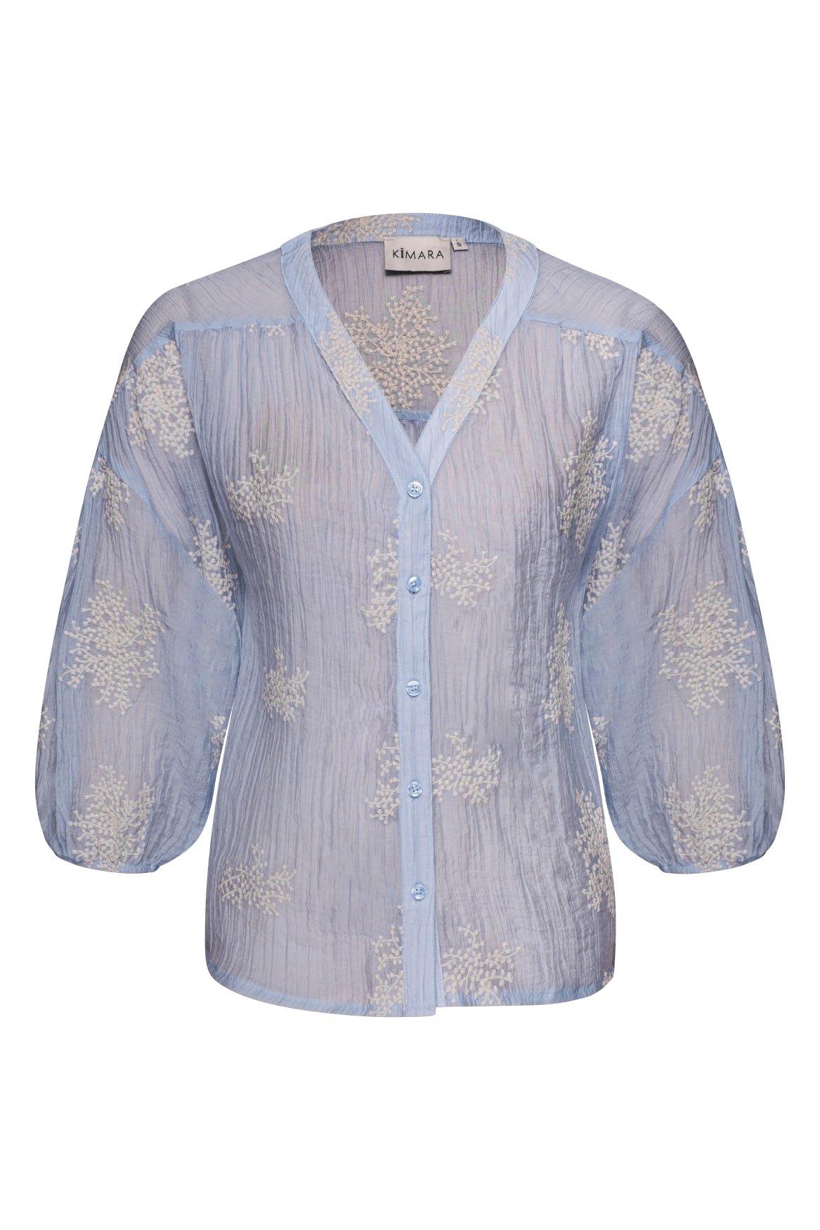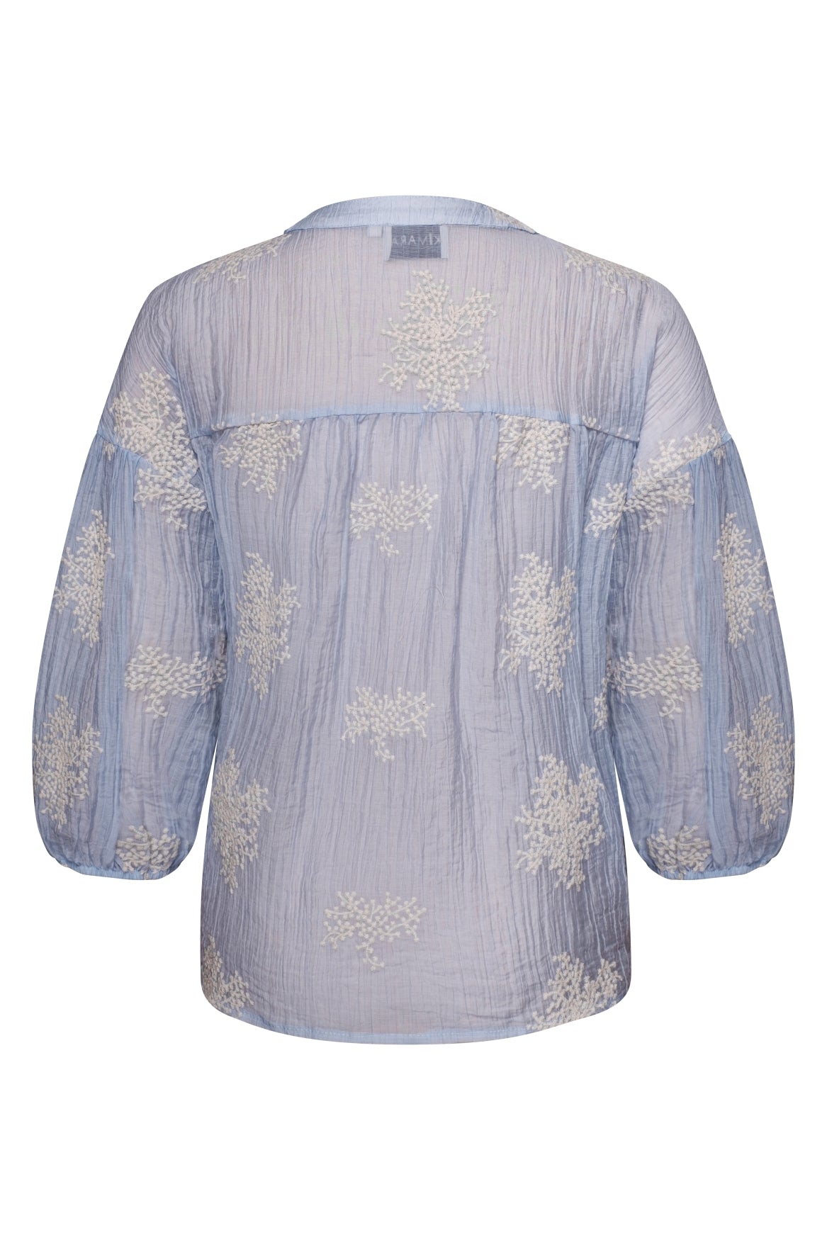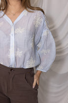 De blouse heeft een mooie V‑hals, een knoopsluiting aan de voorkant en 3/4 pofmouwen die soepel en luchtig vallen. De crinkle‑achtige stof met ton‑sur‑ton bloemenaccenten geeft de Marion Blouse een unieke, moderne bohemian touch perfect voor zowel casual outfits als meer geklede looks.