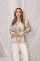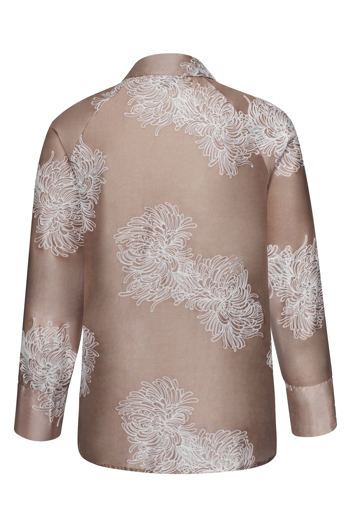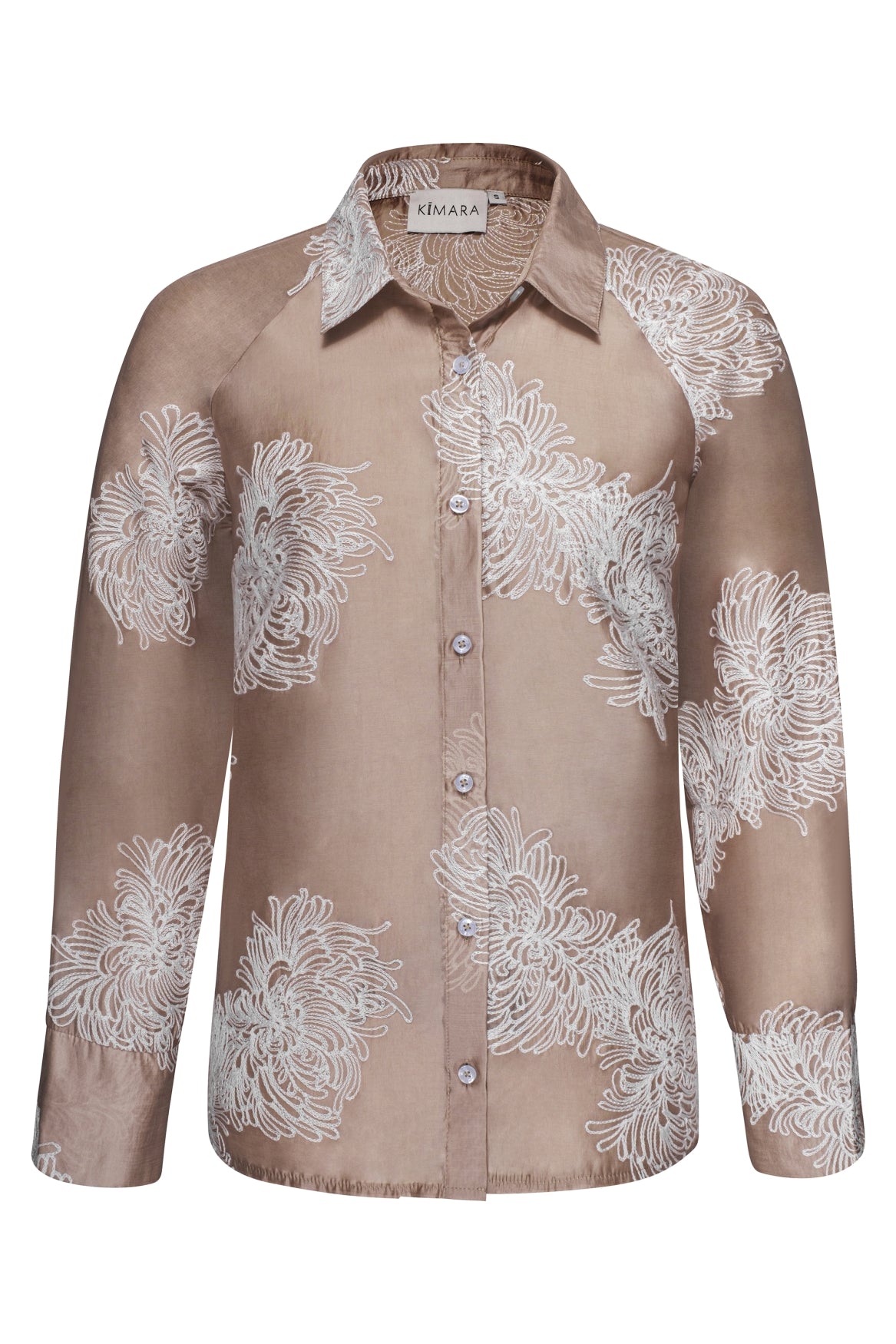 Wat de Brooks Blouse écht uniek maakt, is het prachtige ton‑sur‑ton embroidery dat in sierlijke bloemvormen over de hele blouse is geplaatst. Dit verfijnde borduurwerk geeft diepte, structuur en een luxe couture‑gevoel aan het ontwerp. De transparante basis zorgt voor een luchtige, vrouwelijke look, terwijl de klassieke kraag en doorknoopsluiting het geheel een tijdloze elegantie geven.