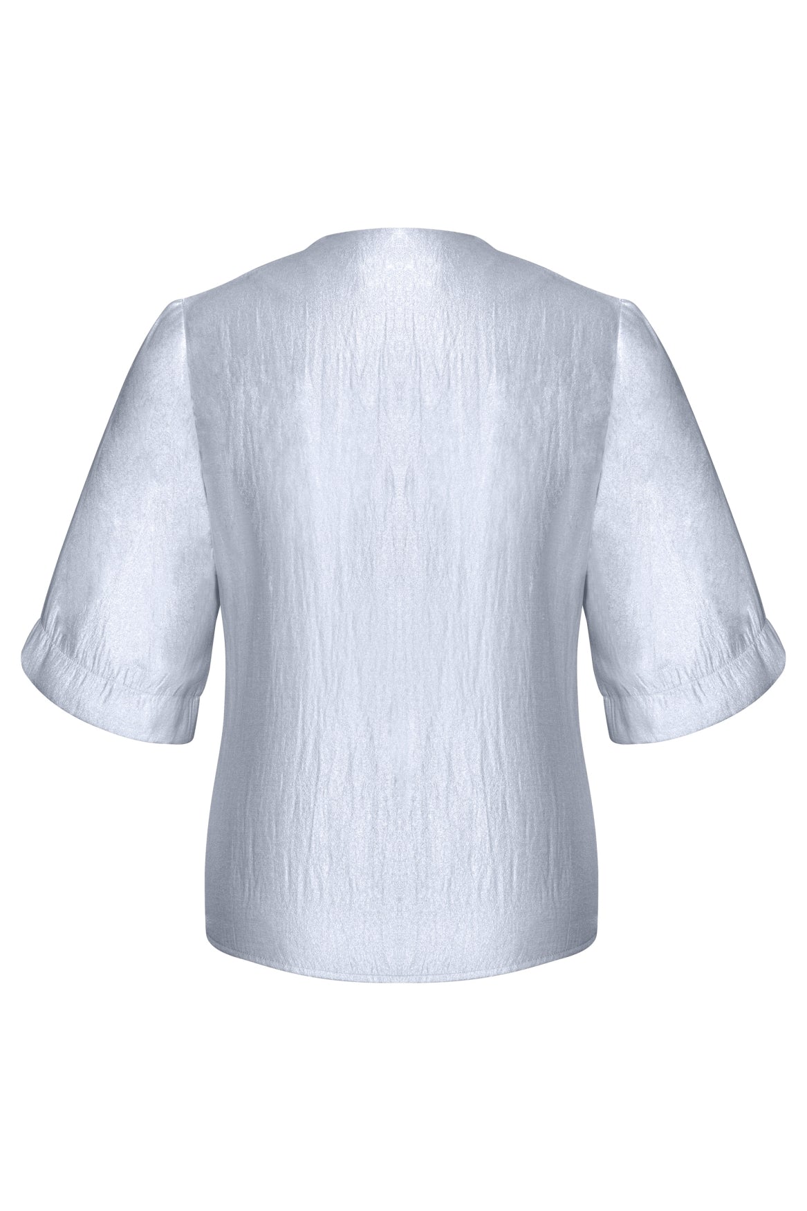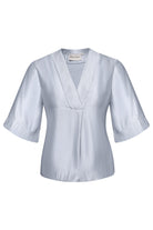 Het ontwerp kenmerkt zich door de elegante V‑hals met overlappende boord en de prachtige 3/4‑mouwen met lichte uitloop voor een vrouwelijk silhouet. De soepelvallende kwaliteit zorgt voor een natuurlijke valling en geeft de blouse een moderne, sophisticated uitstraling. Deze blouse biedt de perfecte balans tussen chic en comfortabel.