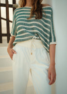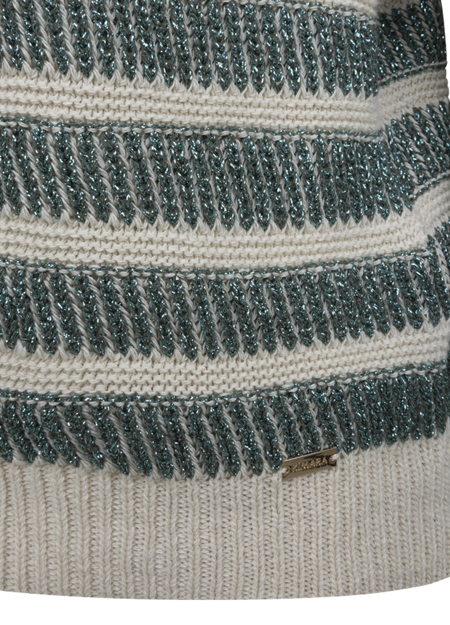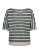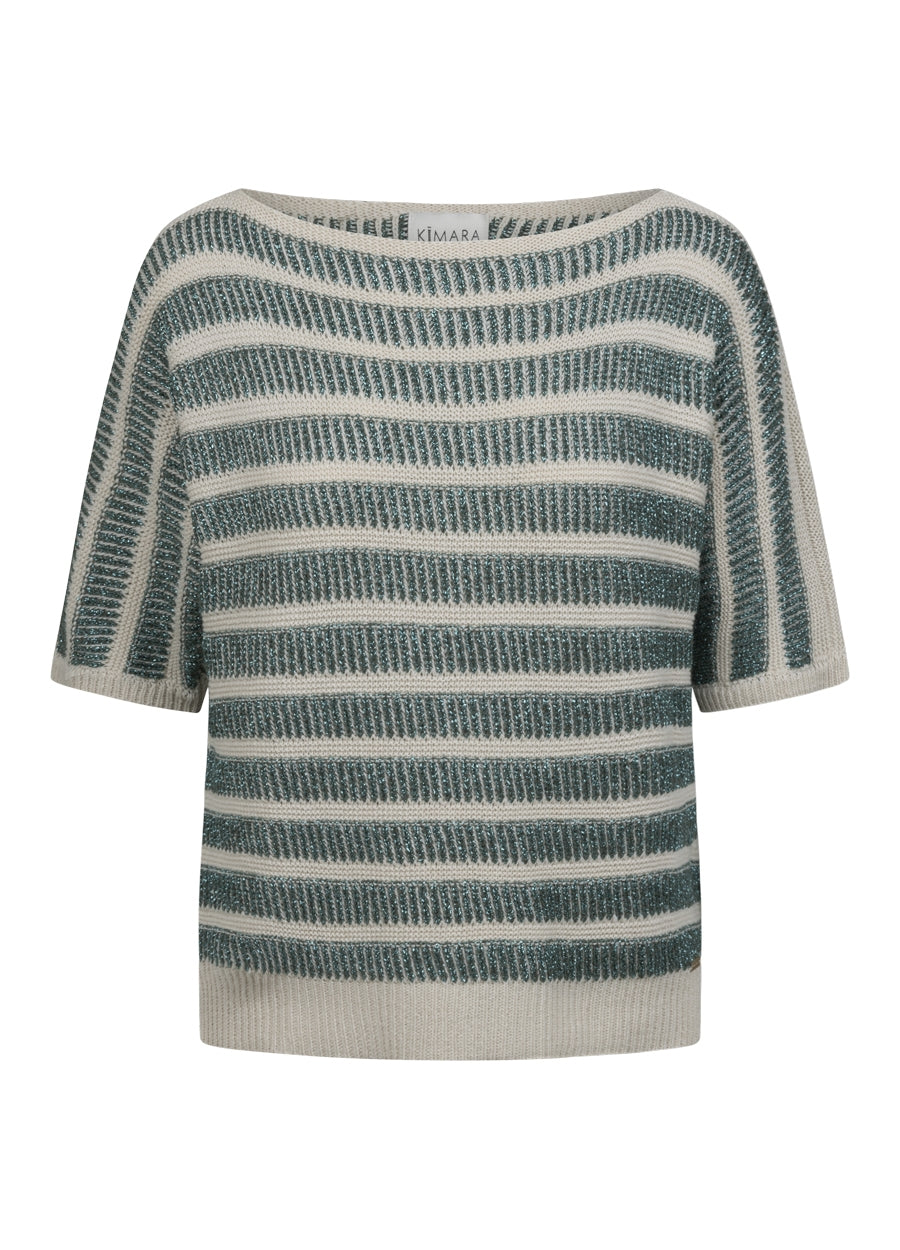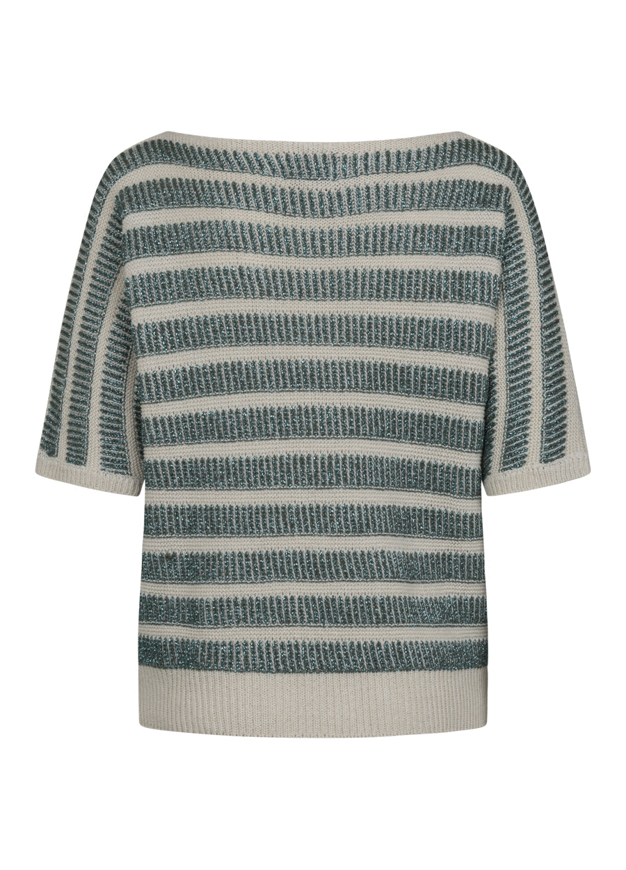 Het ontwerp heeft een brede boothals, korte mouwen en een recht‑boxy silhouet, waardoor de pullover moeiteloos en flatterend valt. Het horizontale streeppatroon met glanzende accenten creëert een speels, modern effect en maakt de Macy Pullover een echte eye‑catcher binnen elke outfit.