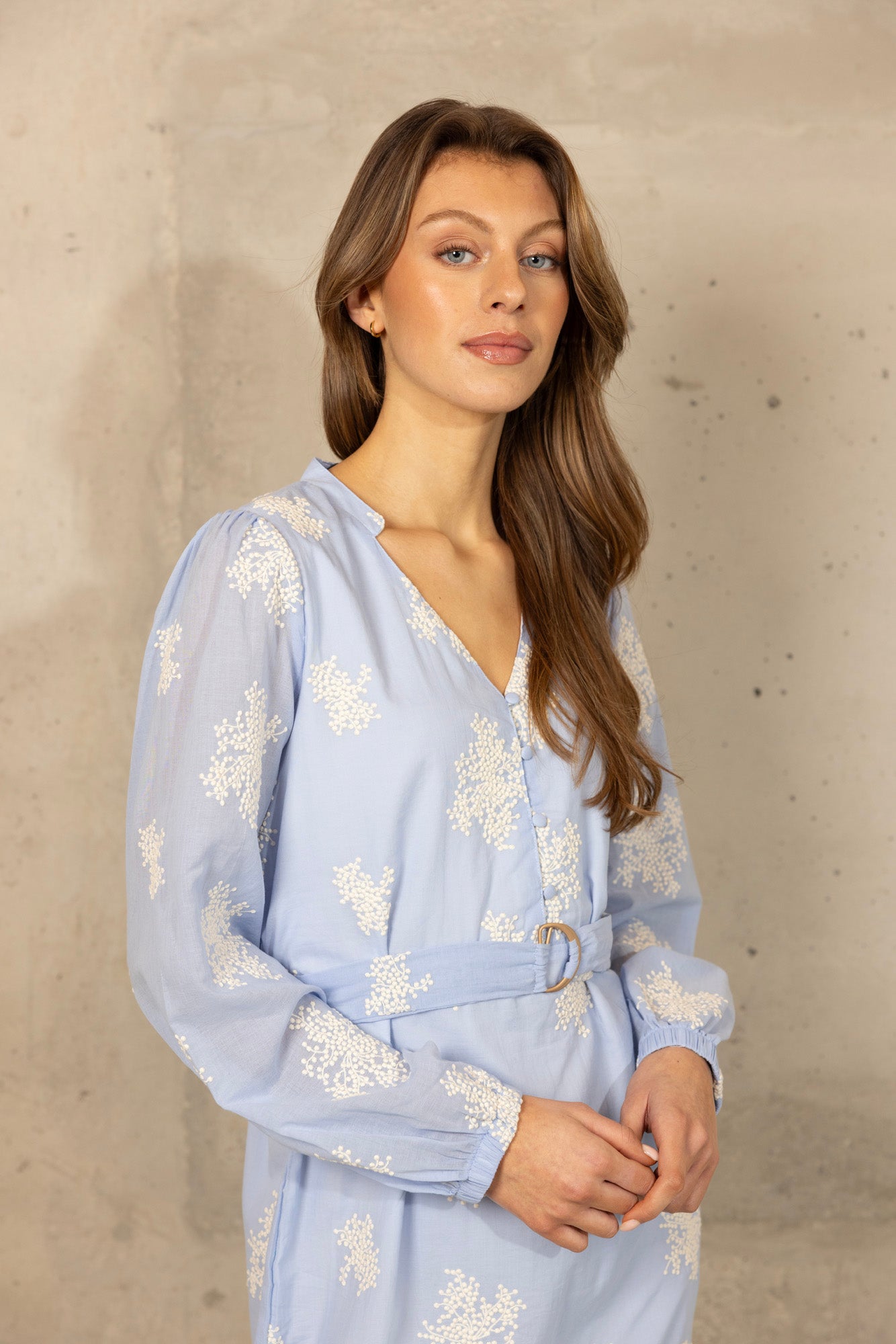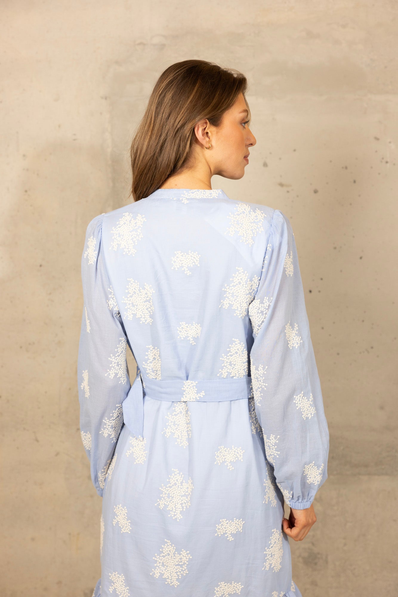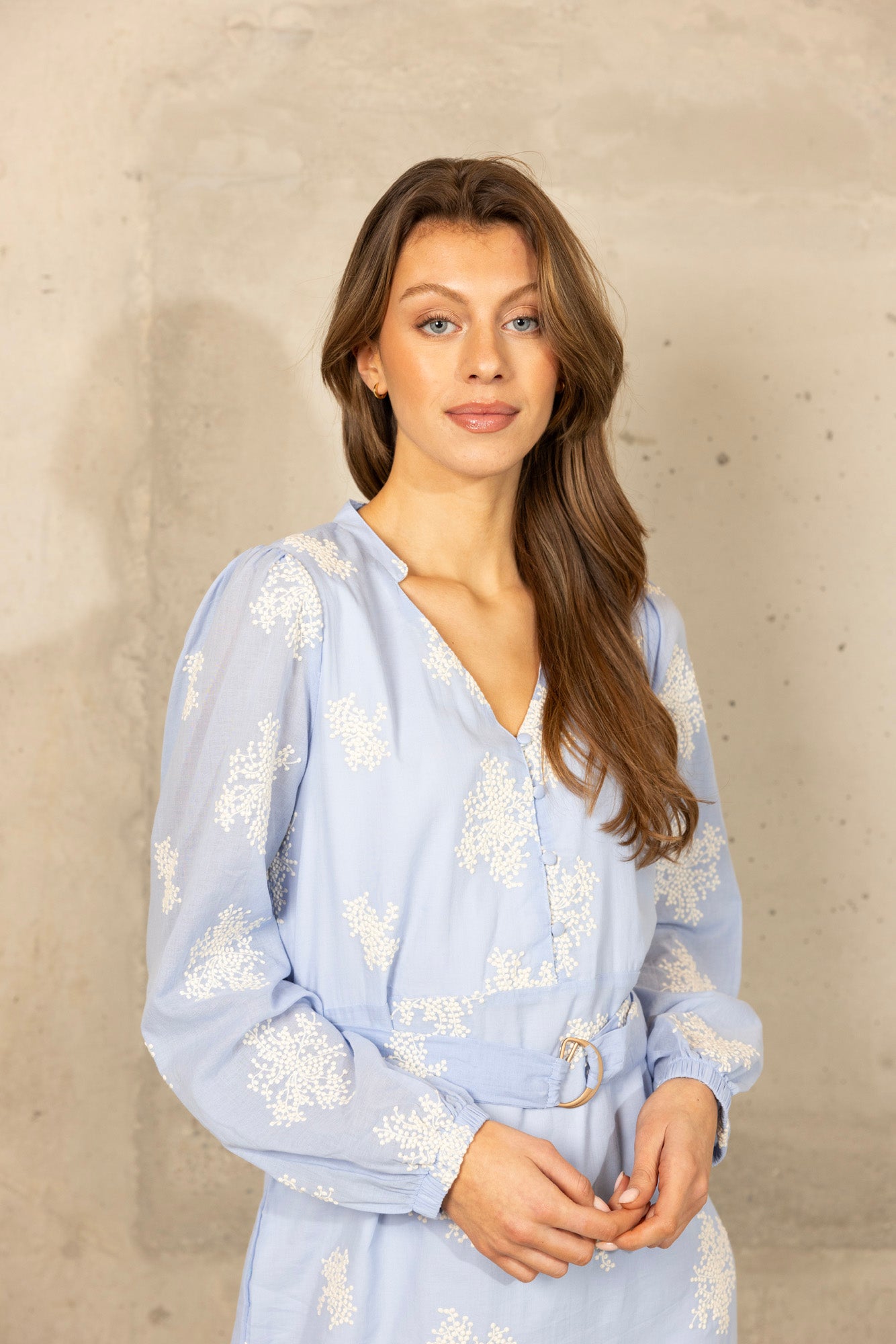 Ontdek de elegantie van de Alma Dress, een prachtig kledingstuk gemaakt van embroidery cotton in de kleur Sky Blue. Deze jurk heeft een verfijnd ontwerp met lange mouwen, een V-halslijn, knopen aan de voorkant en een riem in de taille voor een flatterende pasvorm. De witte borduursels en de gerafelde zoom voegen een vleugje charme en vrouwelijkheid toe, waardoor de Alma Dress perfect is voor zowel casual als formele gelegenheden.