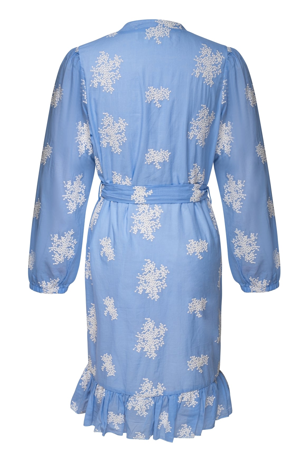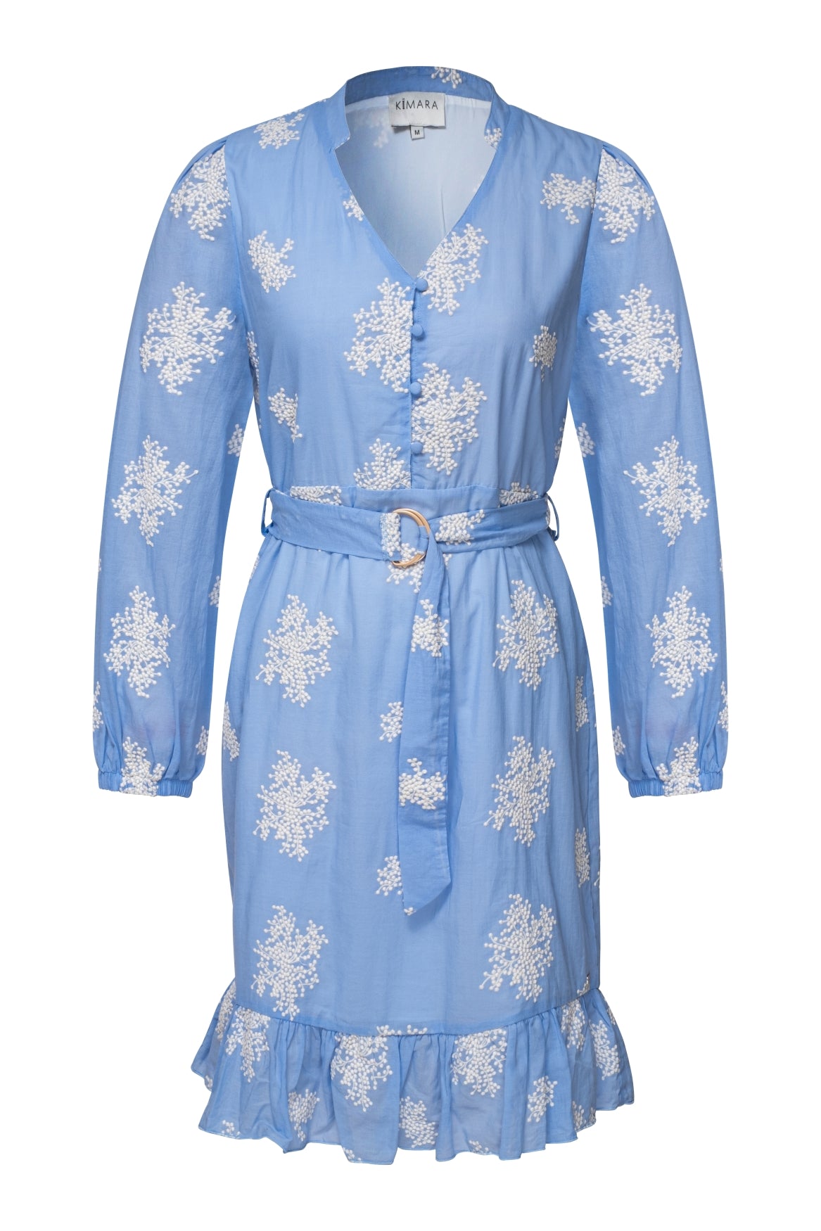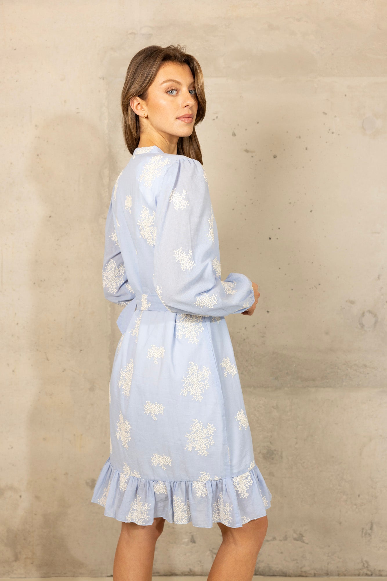 Ontdek de elegantie van de Alma Dress, een prachtig kledingstuk gemaakt van embroidery cotton in de kleur Sky Blue. Deze jurk heeft een verfijnd ontwerp met lange mouwen, een V-halslijn, knopen aan de voorkant en een riem in de taille voor een flatterende pasvorm. De witte borduursels en de gerafelde zoom voegen een vleugje charme en vrouwelijkheid toe, waardoor de Alma Dress perfect is voor zowel casual als formele gelegenheden.
