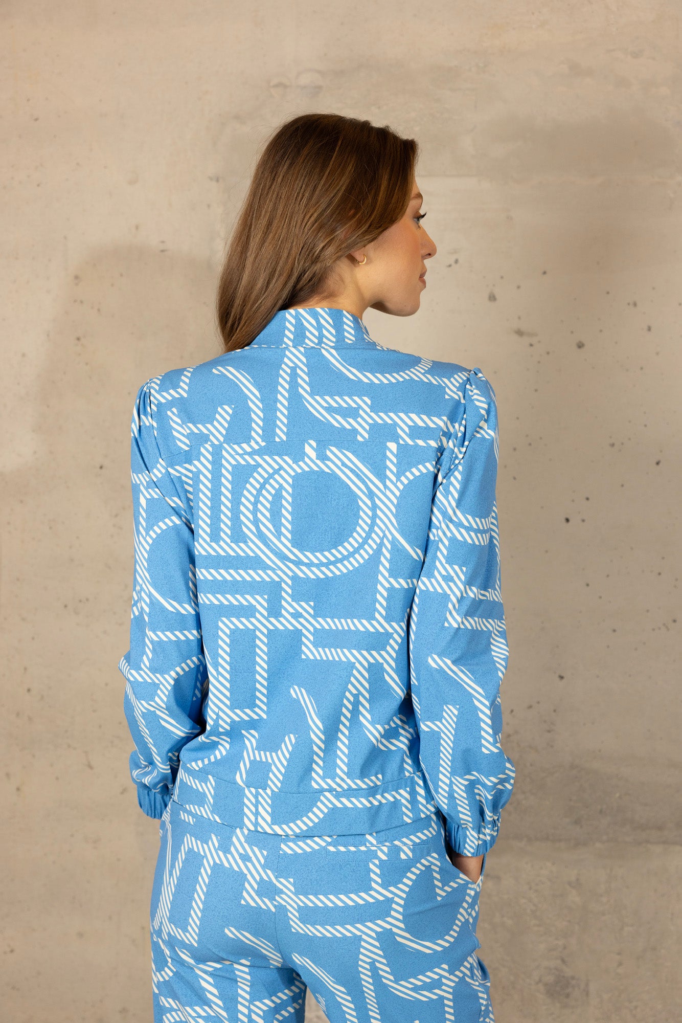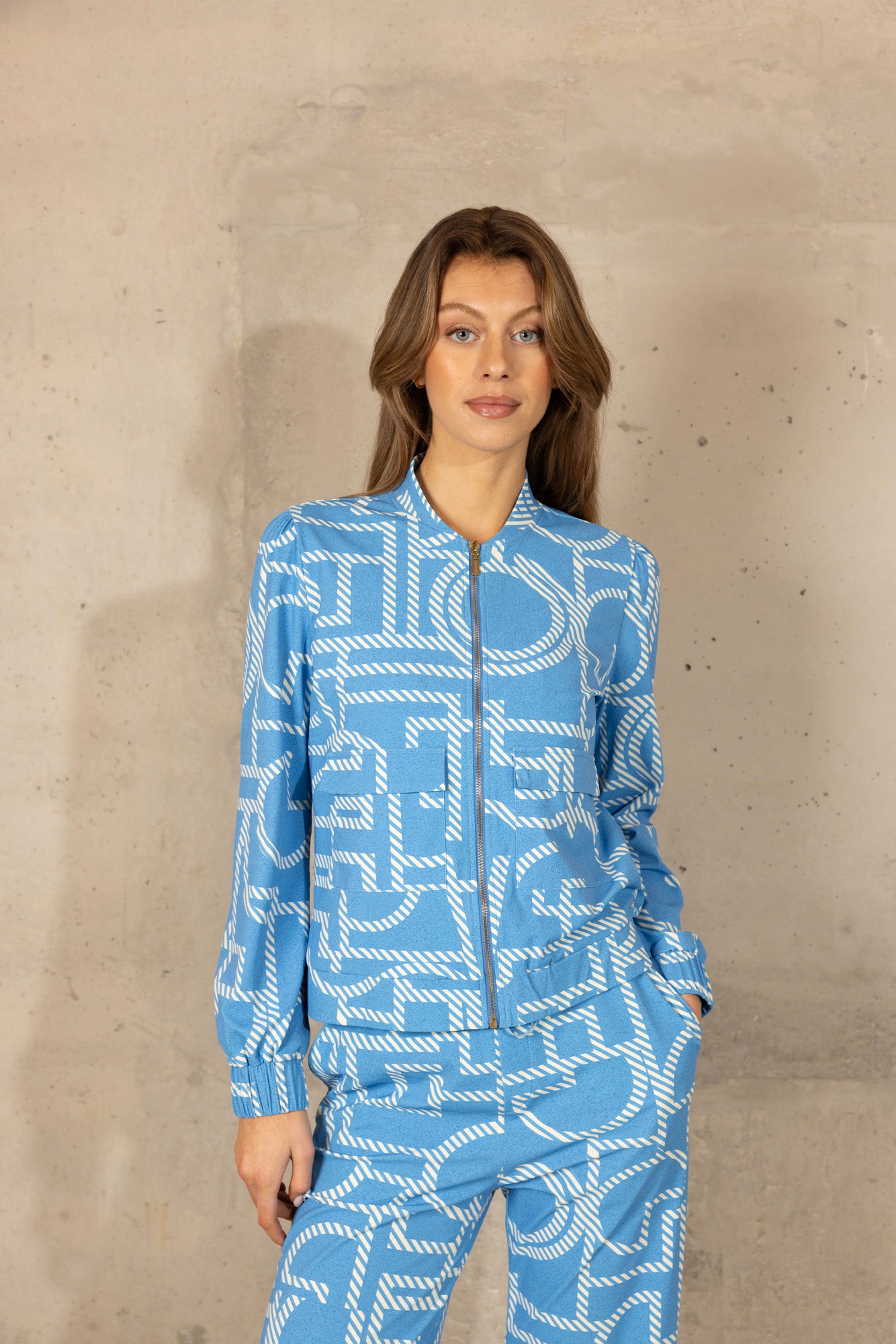 Maak kennis met de Celeste Bomber, een opvallend jasje gemaakt van hoogwaardige travelstof met de unieke Aimery Print. Dit bomberjack heeft een geometrisch patroon in blauw en wit, wat zorgt voor een moderne en stijlvolle uitstraling. De Celeste Bomber is voorzien van een ritssluiting aan de voorkant en zijzakken voor extra functionaliteit. De comfortabele pasvorm en duurzame stof maken dit jasje perfect voor zowel casual als formele gelegenheden.