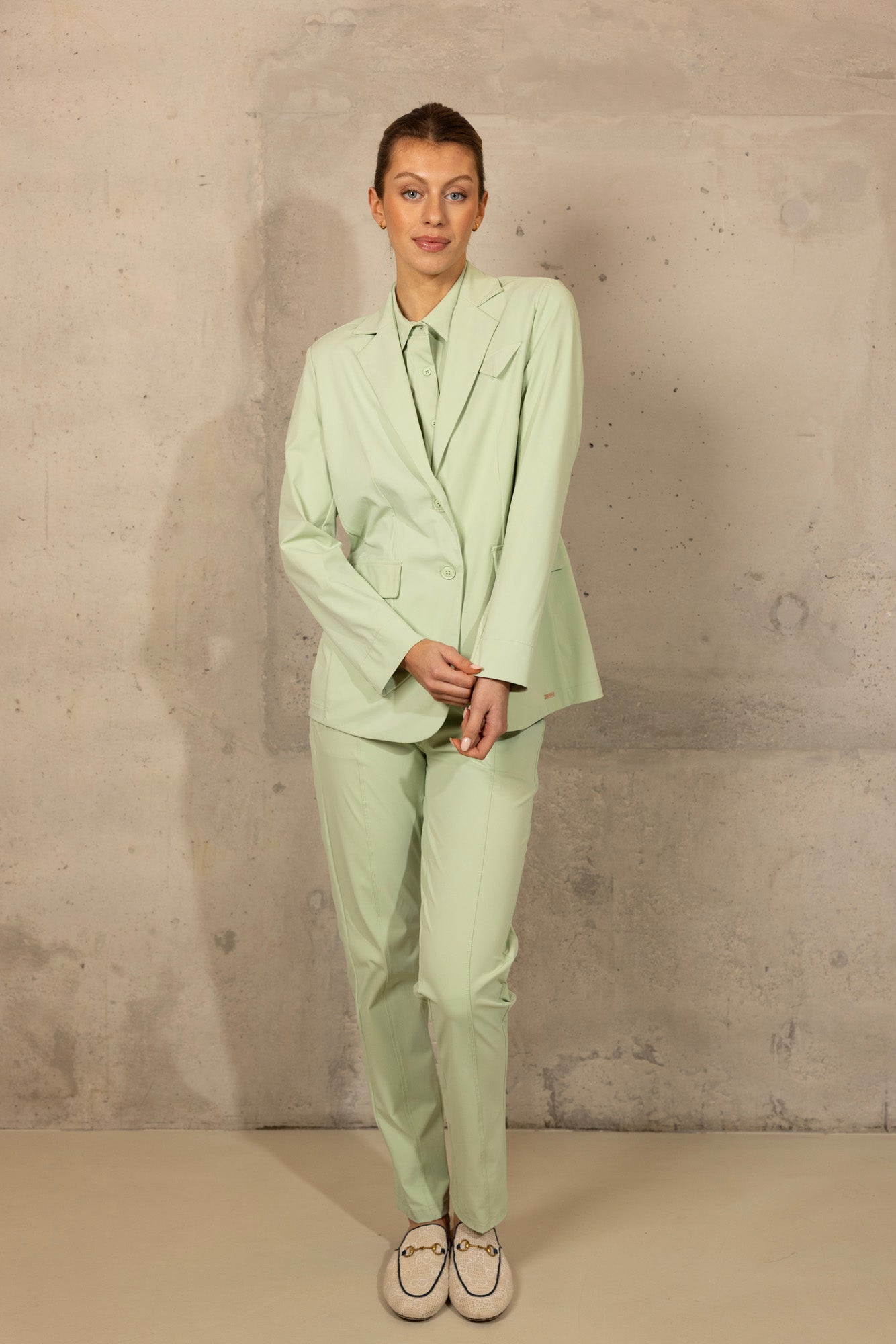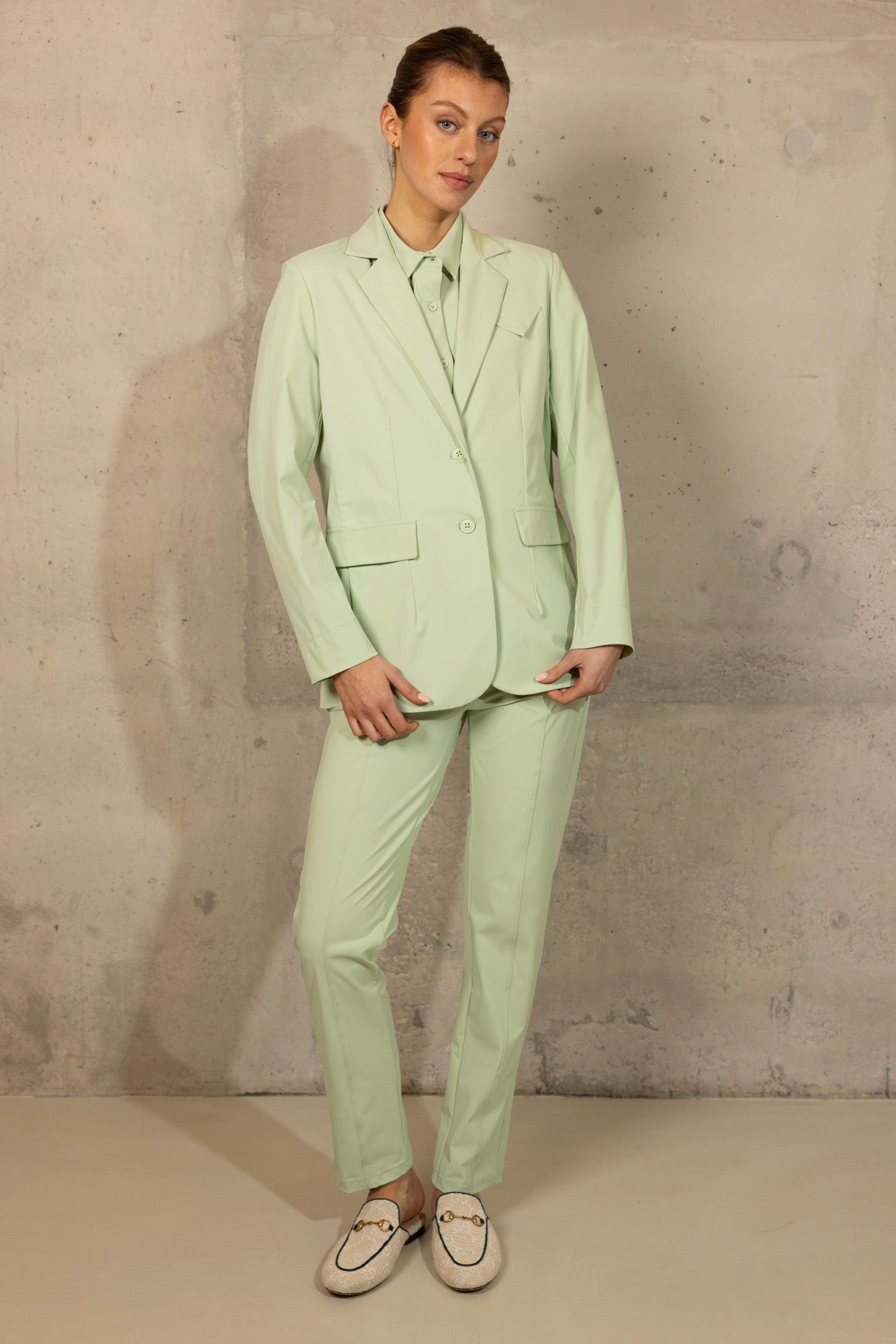 Ontdek de stijlvolle Chey Blazer in Jade, gemaakt van hoogwaardige travelstof. Deze blazer heeft een elegante uitstraling met twee knopen en twee voorzakken met kleppen. De lichte groene kleur zorgt voor een frisse en moderne look. De travelstof biedt comfort en flexibiliteit, ideaal voor zowel zakelijke als casual gelegenheden. Combineer de Chey Blazer met de bijpassende Lise Pants in Jade voor een complete en verfijnde outfit, of draag hem met de Ezie Pants in Jade en een andere top uit onze collectie voor een veelzijdige en modieuze look.