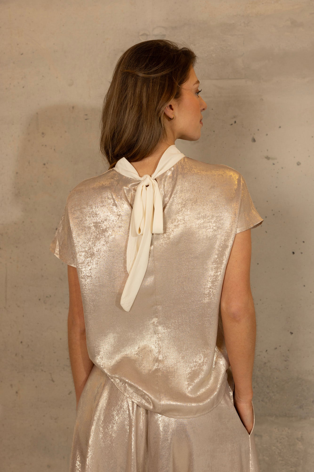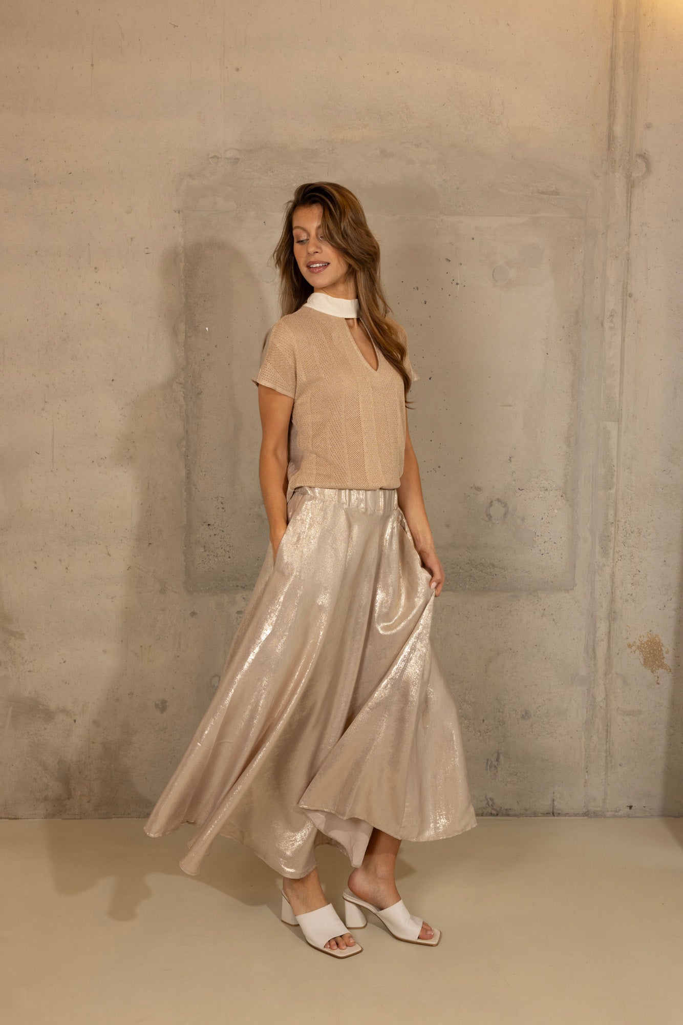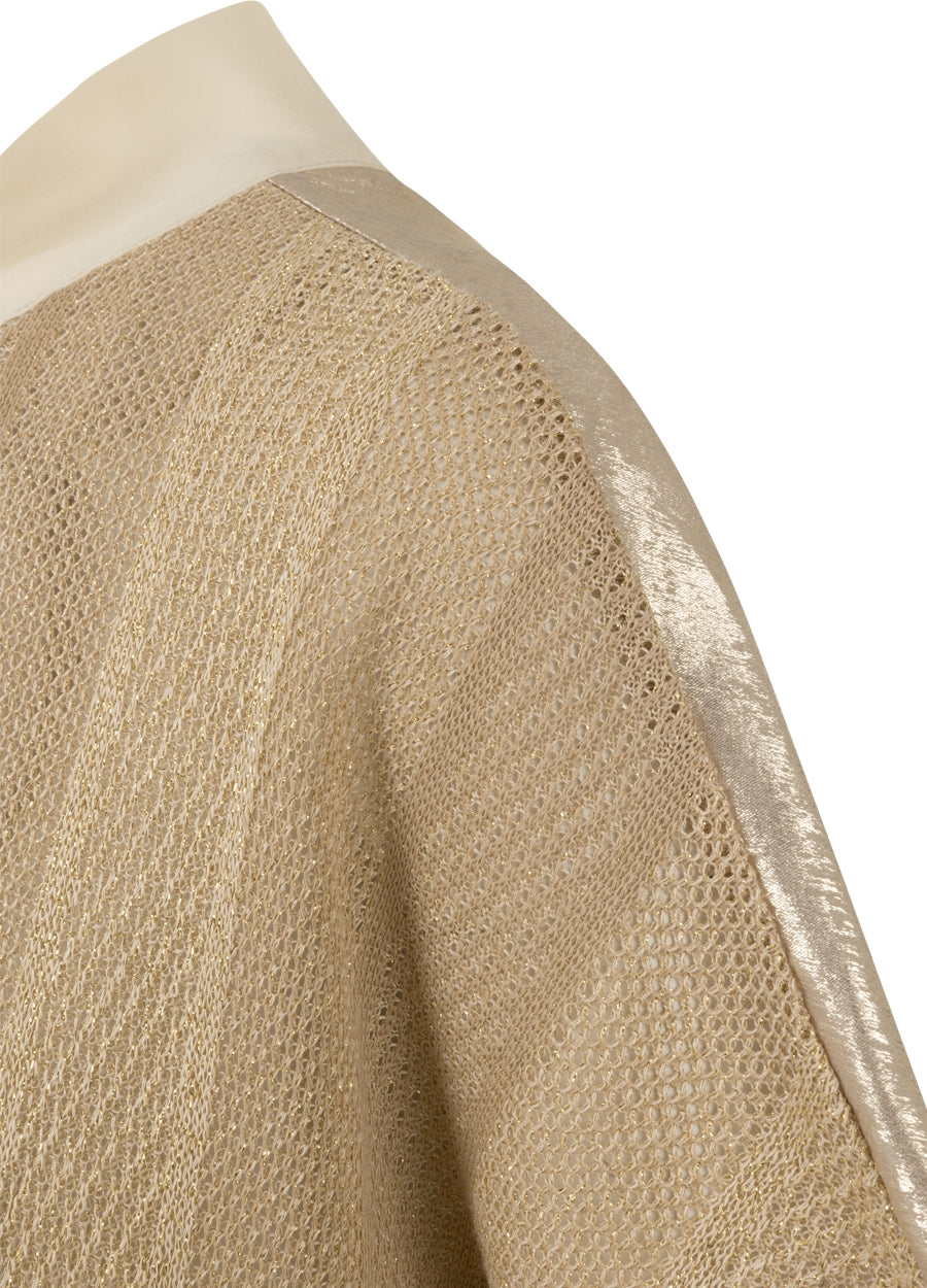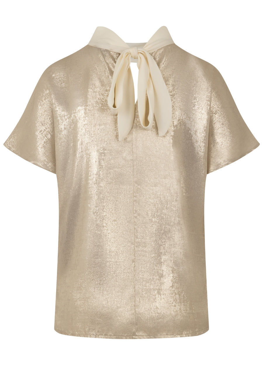 Ontdek de sprankelende Kiki Top in Sand, met een voorkant van glitter knit en een achterkant van glanzende stof. Deze top heeft een keyhole halslijn met een witte kraag aan de voorkant, en een witte strik aan de achterkant, wat zorgt voor een elegante en opvallende uitstraling. De combinatie van glitter knit en shine stof biedt zowel comfort als een vleugje glamour, perfect voor zowel casual als feestelijke gelegenheden. Combineer de Kiki Top met de bijpassende Mette Skirt voor een complete en stijlvolle look.