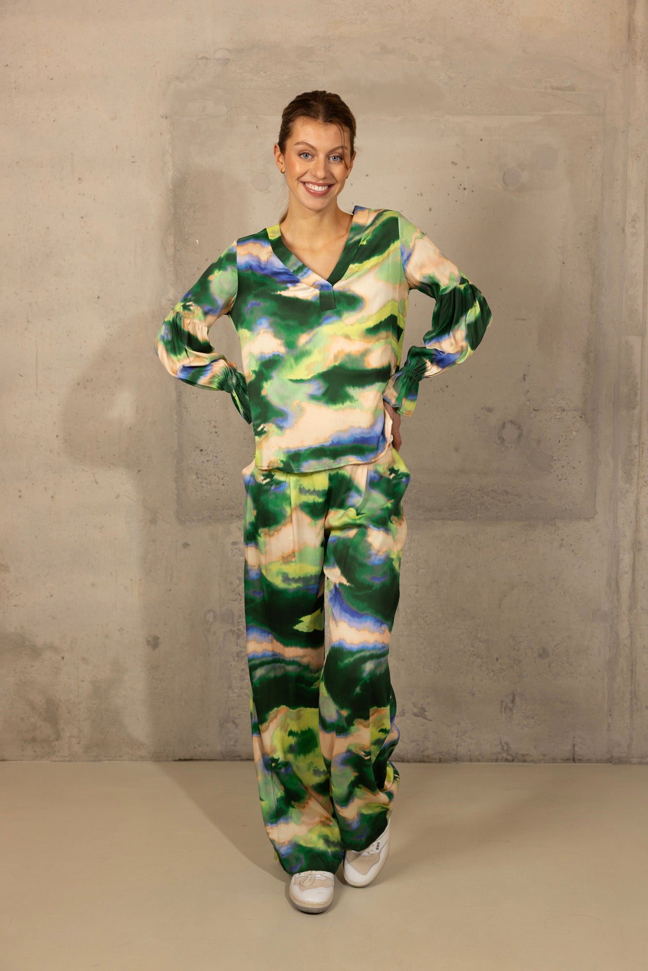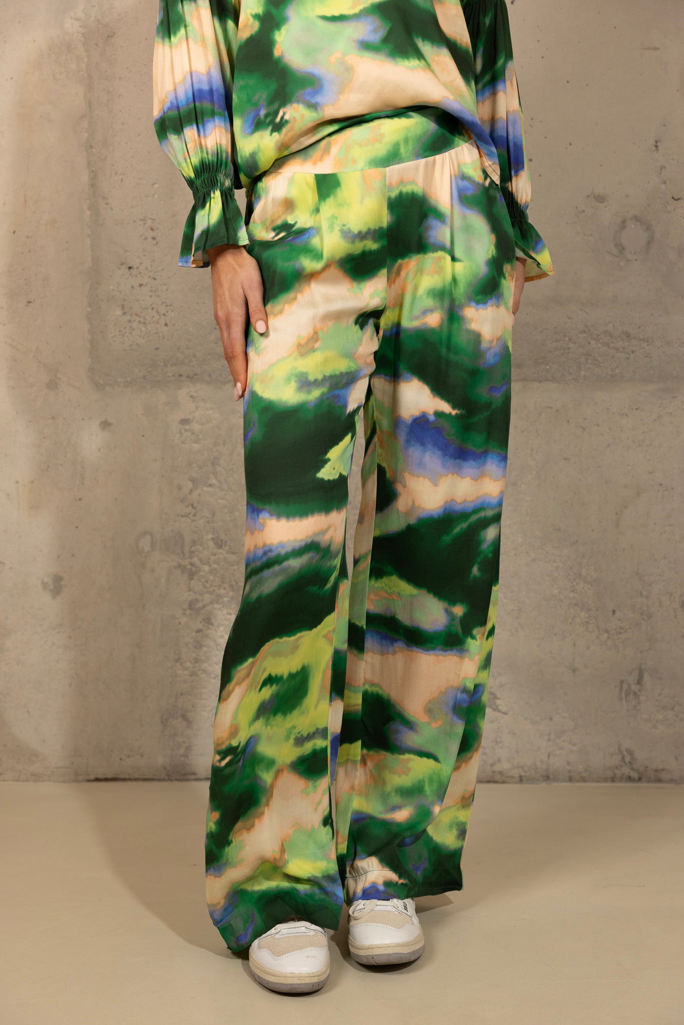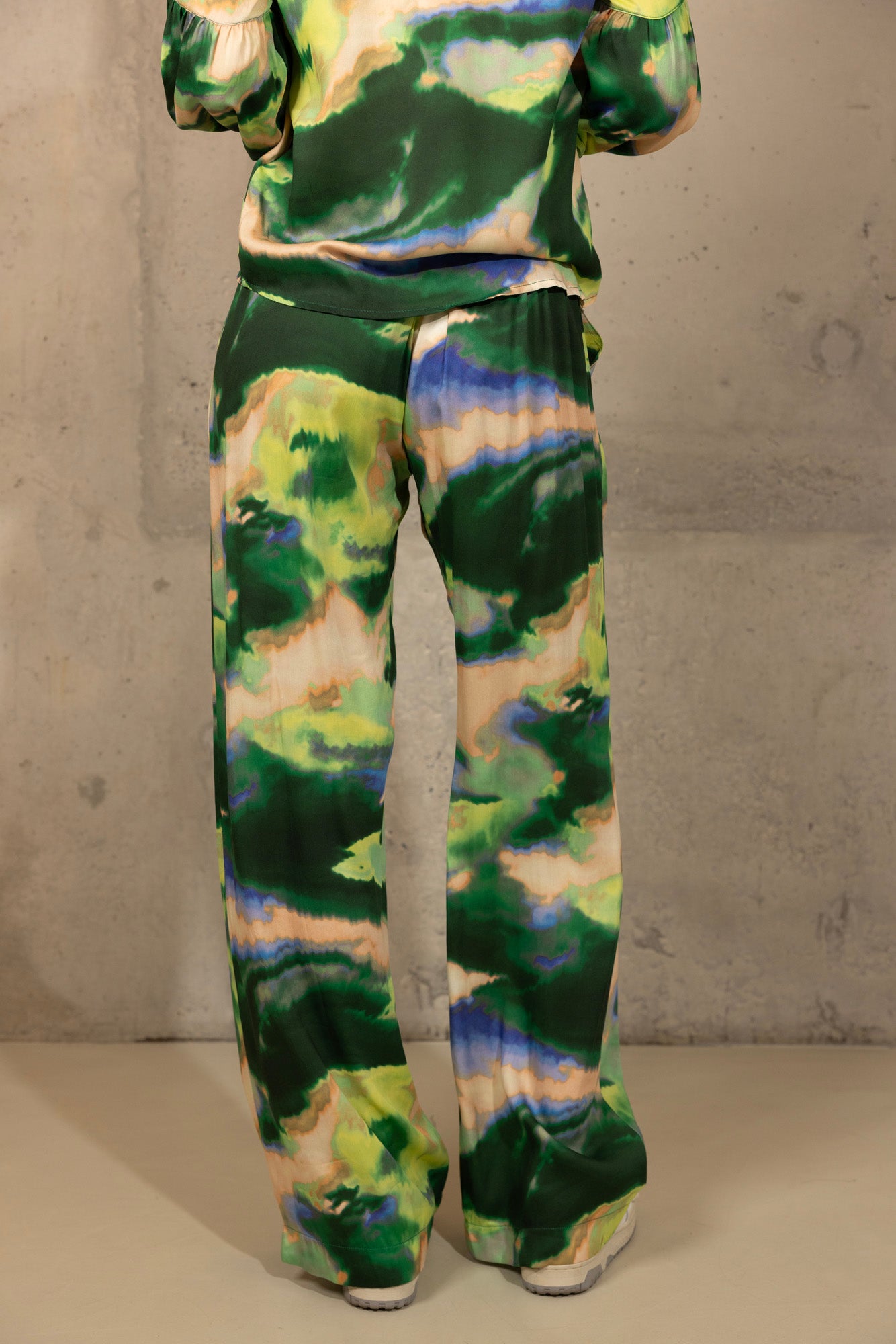 Ontdek de levendige Meike Pants, gemaakt van luxueuze viscose satin met de prachtige aquarelle print. Deze broek heeft een kleurrijk en artistiek patroon in tinten groen, blauw, geel en wit, wat zorgt voor een opvallende en modieuze uitstraling. De zachte en soepele viscose satin stof biedt ultiem comfort en een elegante pasvorm, perfect voor zowel casual als formele gelegenheden. De broek heeft een wijde pijp en zijzakken voor extra functionaliteit.