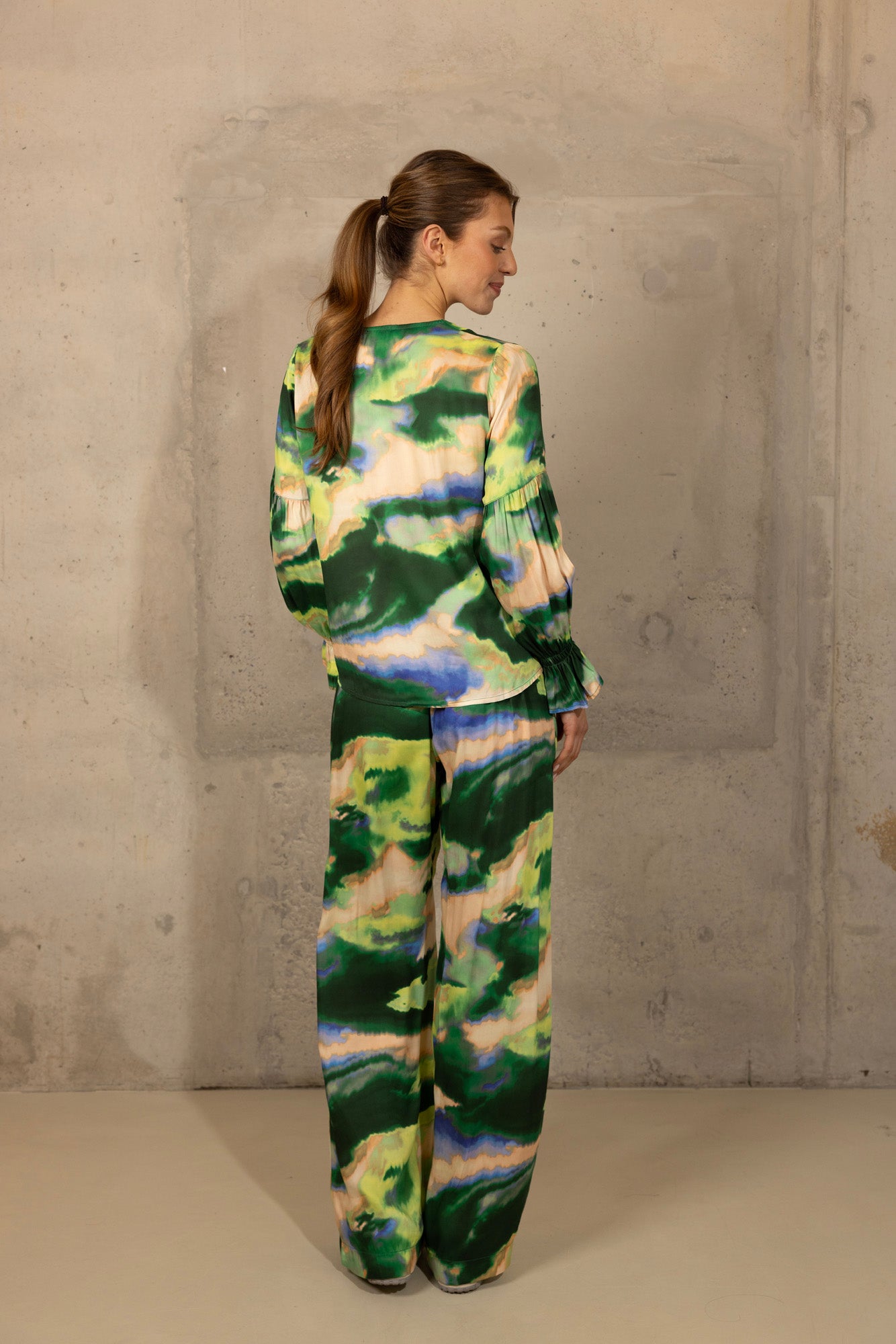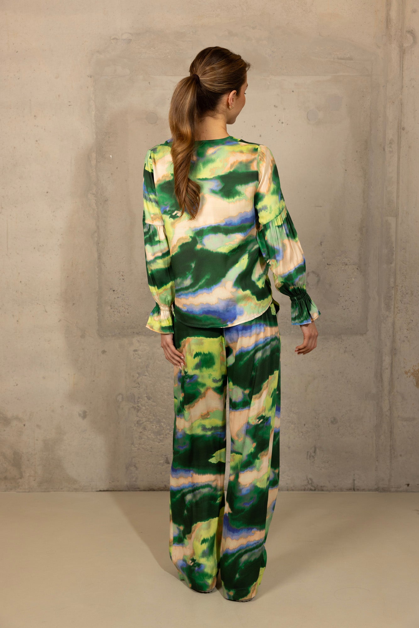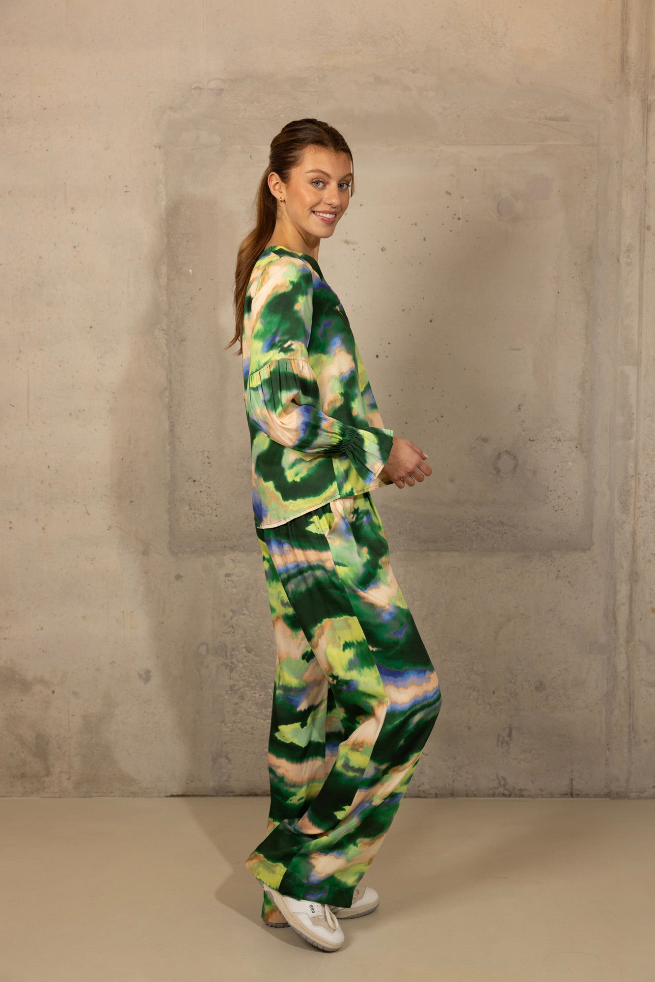 Ontdek de levendige Meike Pants, gemaakt van luxueuze viscose satin met de prachtige aquarelle print. Deze broek heeft een kleurrijk en artistiek patroon in tinten groen, blauw, geel en wit, wat zorgt voor een opvallende en modieuze uitstraling. De zachte en soepele viscose satin stof biedt ultiem comfort en een elegante pasvorm, perfect voor zowel casual als formele gelegenheden. De broek heeft een wijde pijp en zijzakken voor extra functionaliteit.