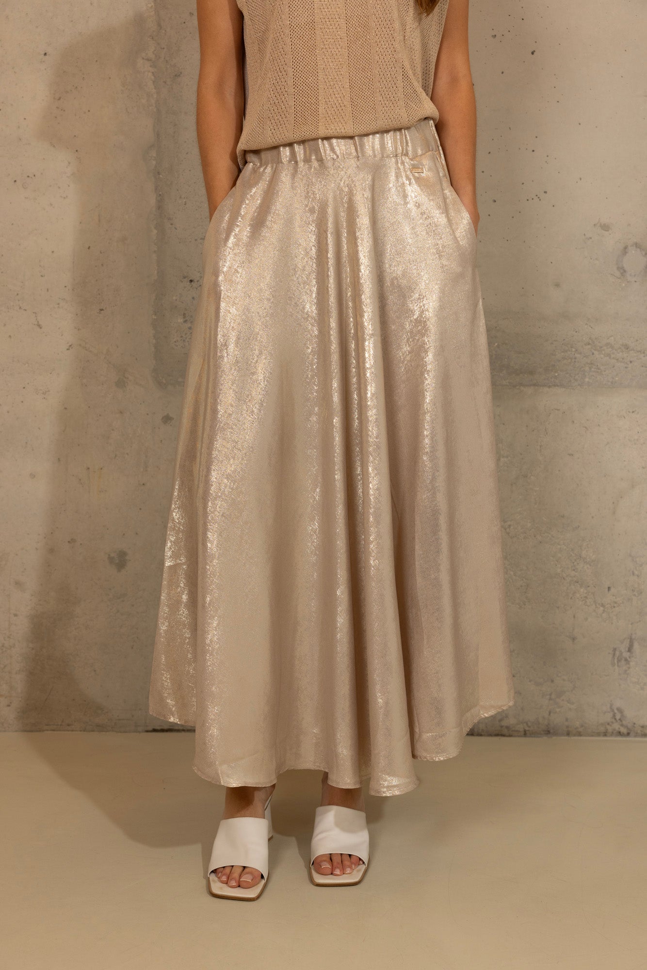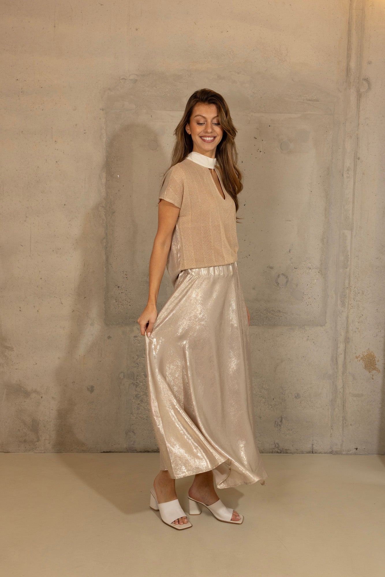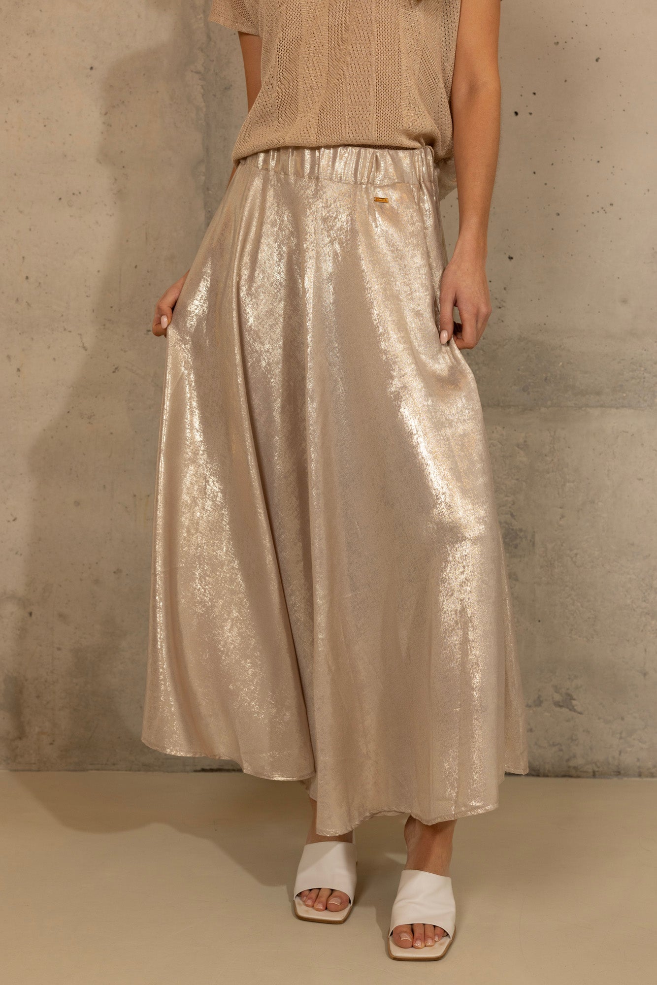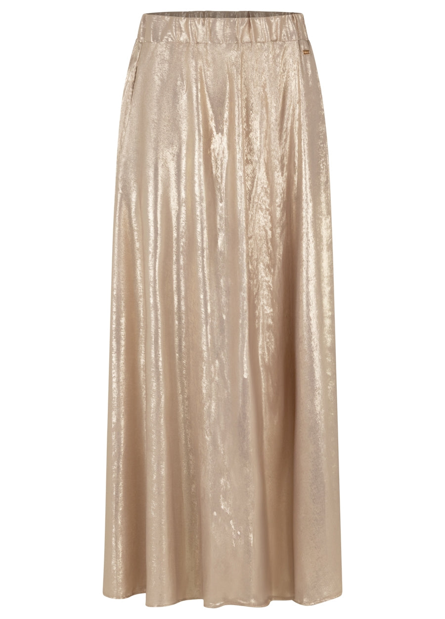 Ontdek de luxe van de Mella Skirt, een schitterende rok gemaakt van Shine in de kleur Gold. Deze lange, vloeiende rok heeft een elastische tailleband en is gemaakt van een glad, reflecterend materiaal dat het licht vangt en een elegante uitstraling geeft. De Mella Skirt is perfect voor zowel casual als formele gelegenheden en voegt een vleugje glamour toe aan elke outfit.