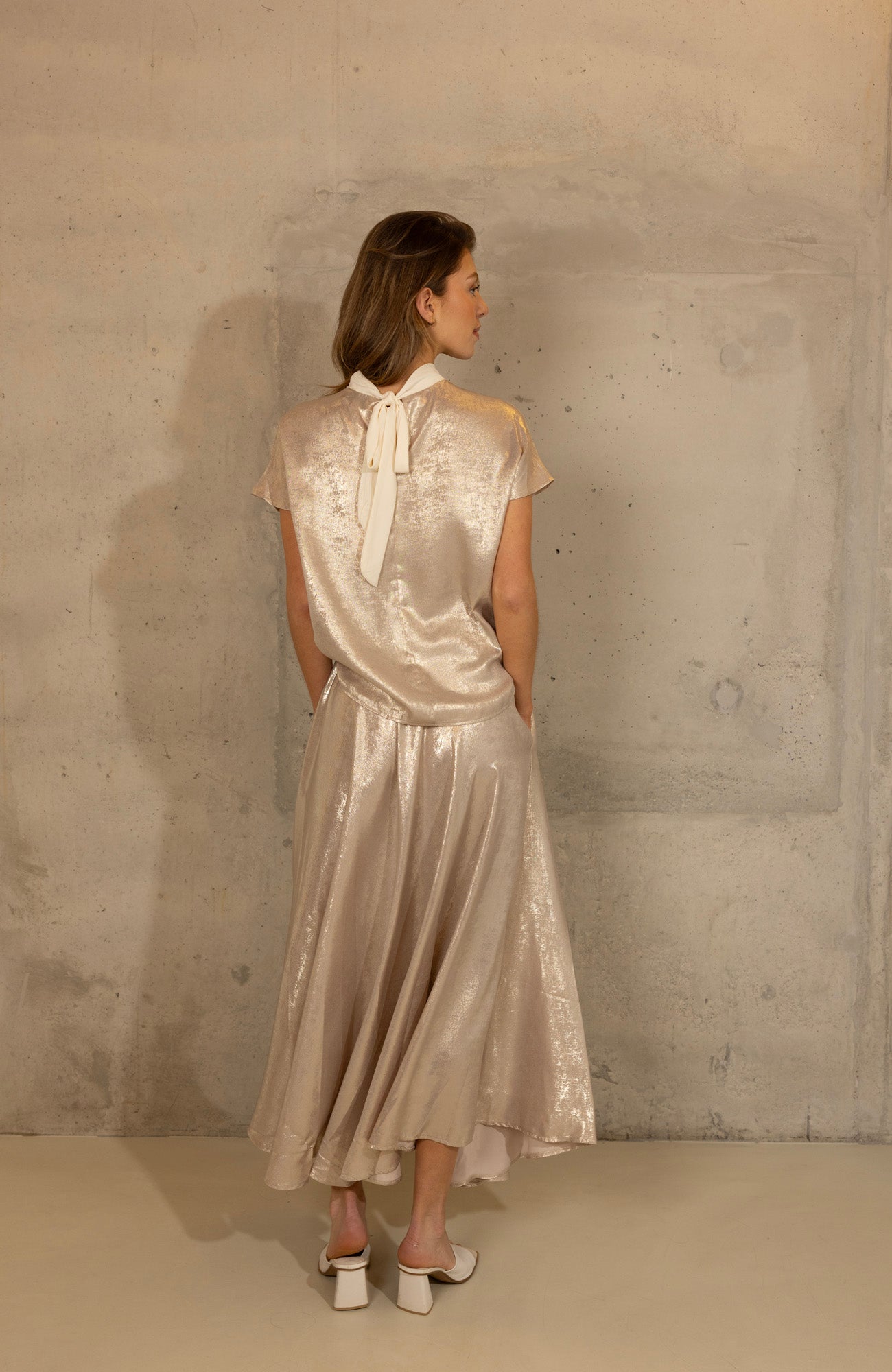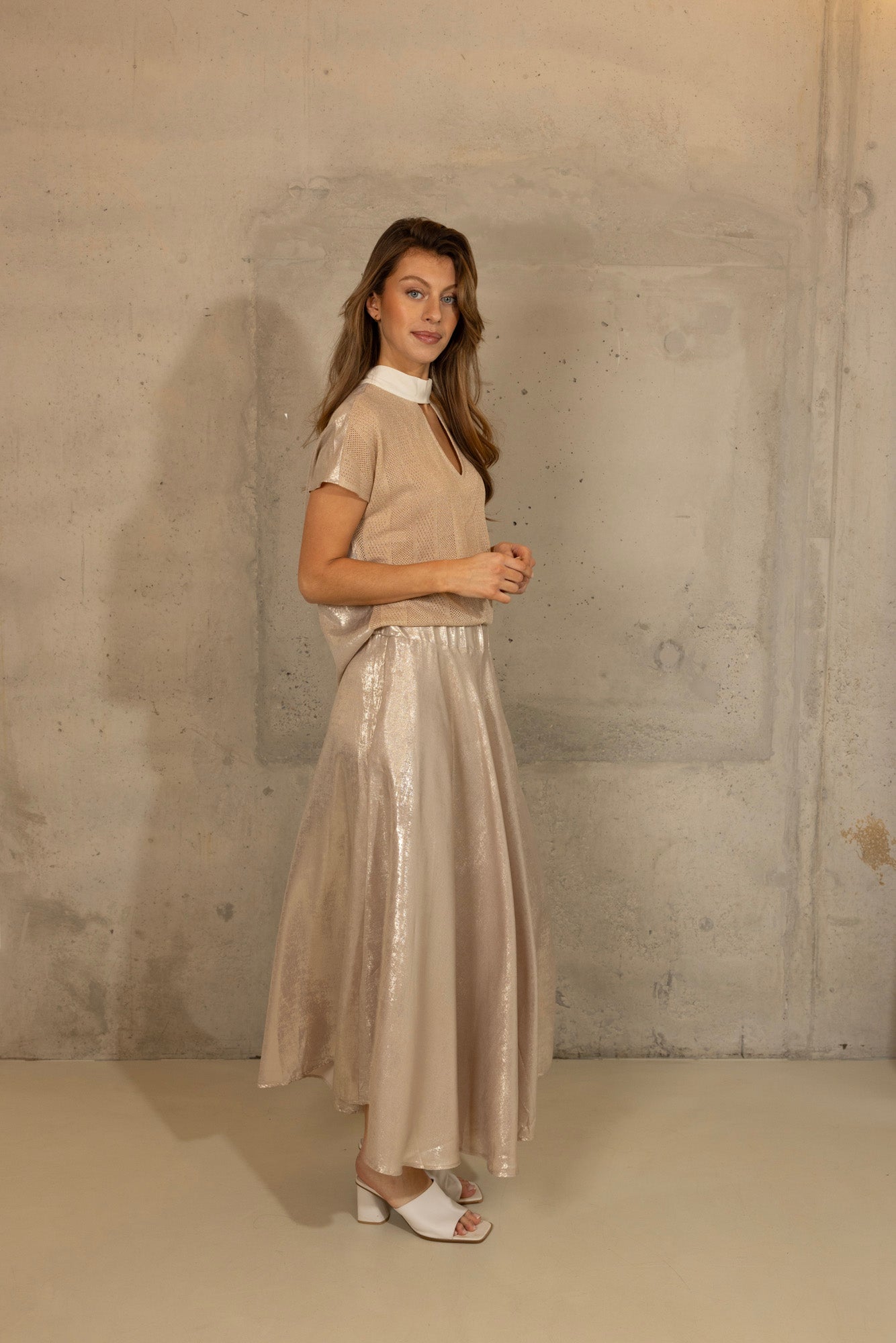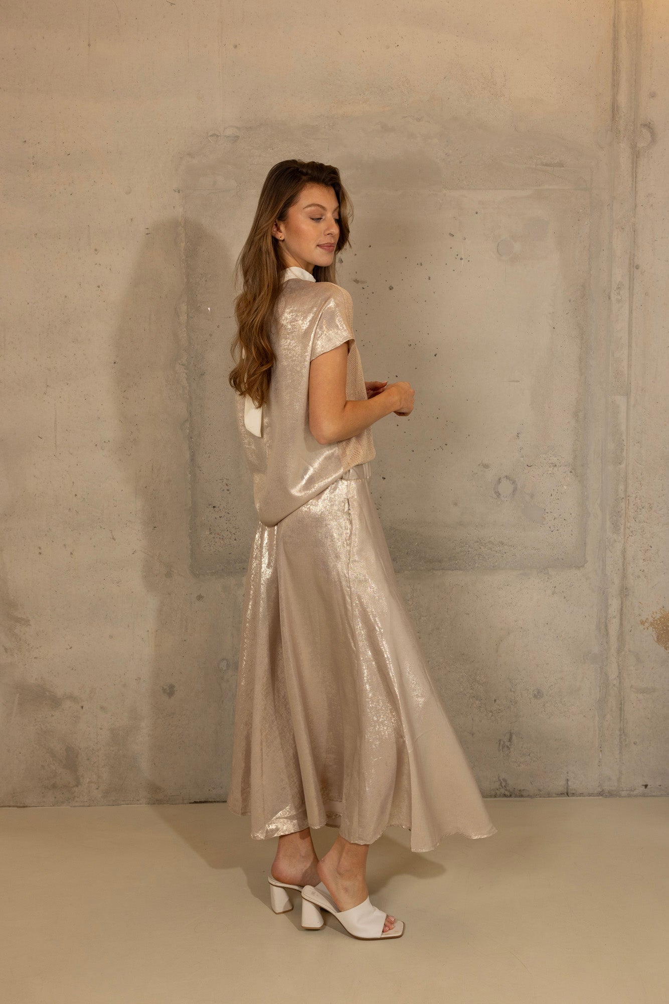 Ontdek de luxe van de Mella Skirt, een schitterende rok gemaakt van Shine in de kleur Gold. Deze lange, vloeiende rok heeft een elastische tailleband en is gemaakt van een glad, reflecterend materiaal dat het licht vangt en een elegante uitstraling geeft. De Mella Skirt is perfect voor zowel casual als formele gelegenheden en voegt een vleugje glamour toe aan elke outfit.