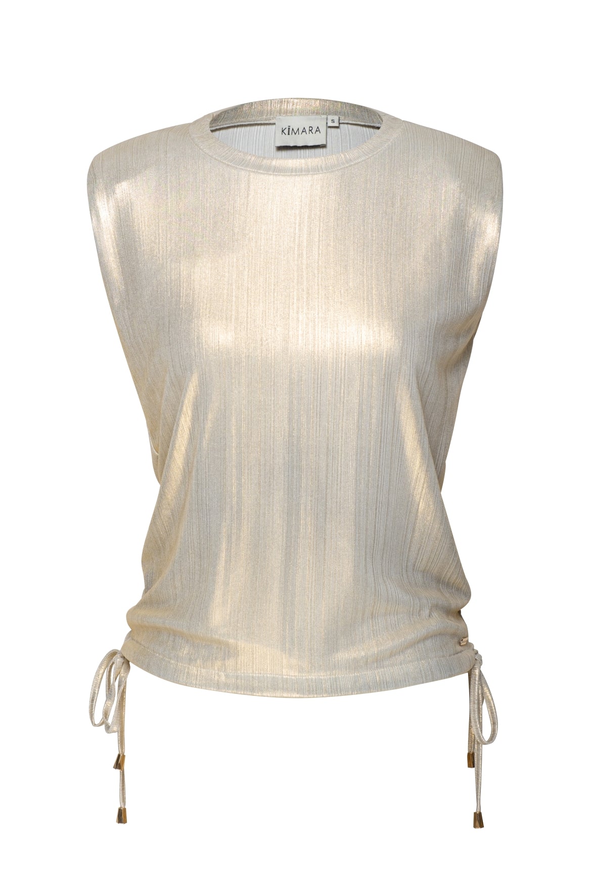 Ontdek de sprankelende Mieka Top, gemaakt van glanzende shimmer stof. Deze mouwloze top heeft geplooide details bij de schouders en is voorzien van shoulder pads voor een extra stijlvolle en gestructureerde look. Verkrijgbaar in de kleuren Salt, Gold, Aqua en Polar Blue. De Mieka Top biedt een vleugje glamour en is perfect voor zowel casual als feestelijke gelegenheden. Combineer deze bestseller met de bijpassende Michelle Pants voor een complete en modieuze look die zeker de aandacht trekt.