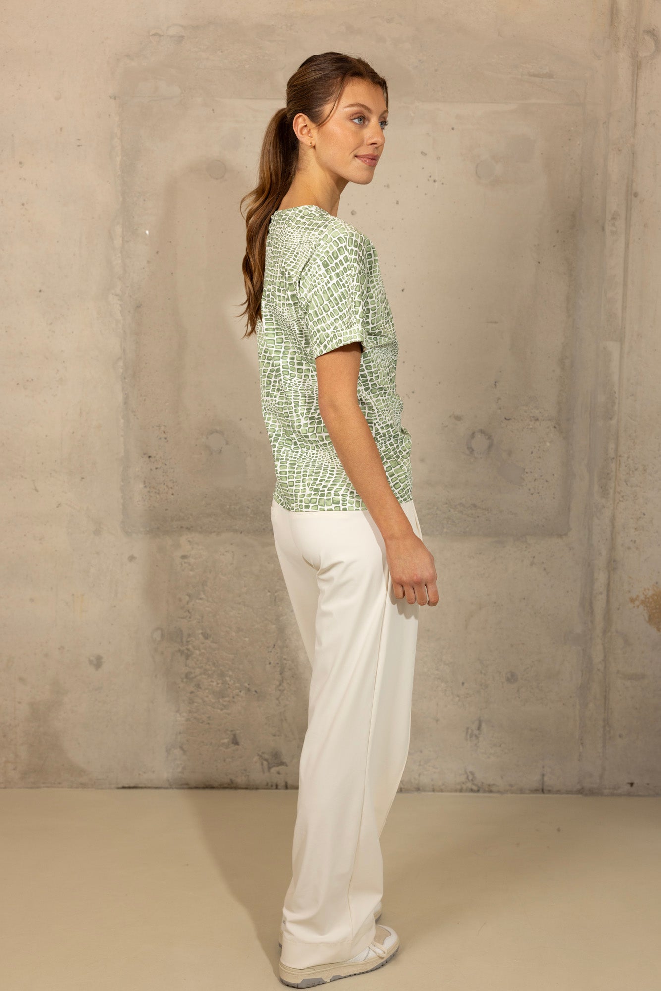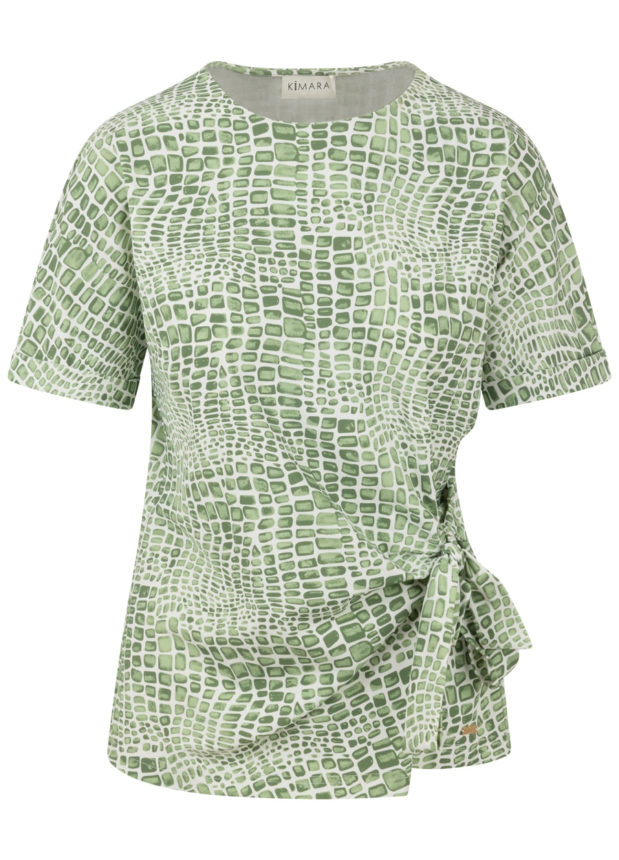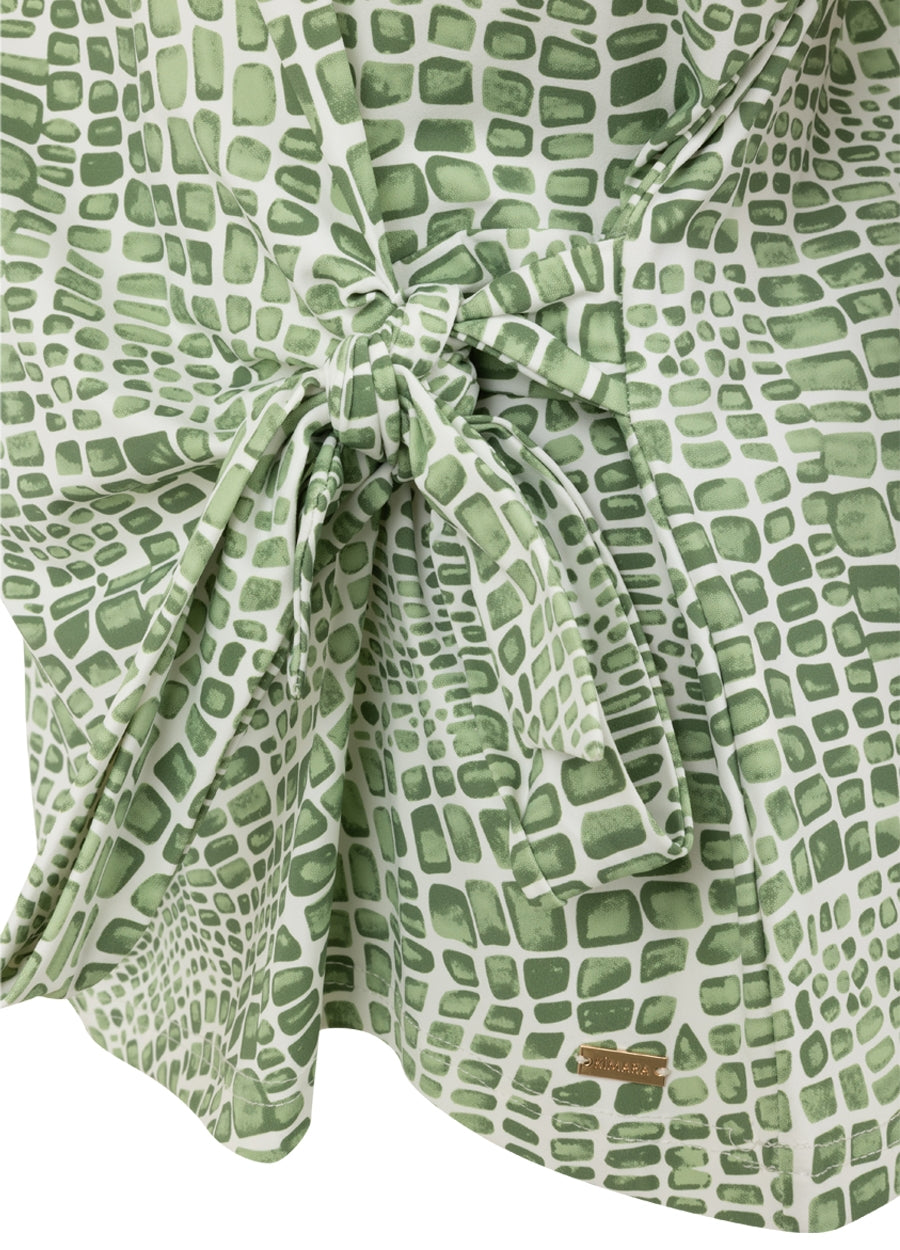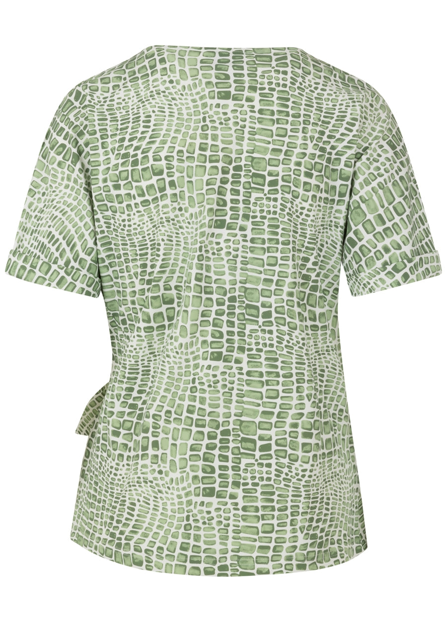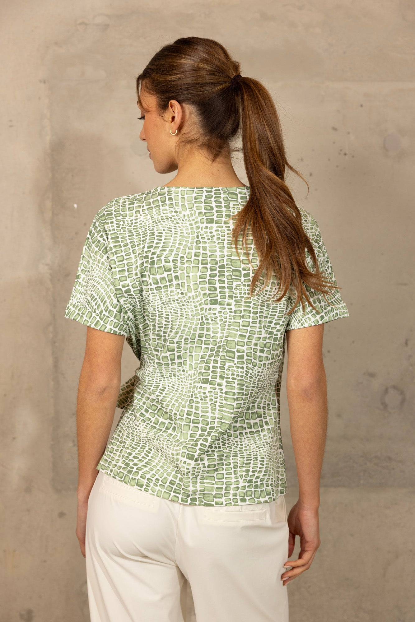 Ontdek de Negin Top, een perfecte mix van stijl en functionaliteit. Deze top is uitgevoerd in een opvallende groene en witte krokodillenprint, wat zorgt voor een modieuze en gedurfde look. Gemaakt van hoogwaardige travelstof, biedt de Negin Top ultiem draagcomfort en is hij kreukvrij, ademend en duurzaam. De top heeft korte mouwen en een stijlvolle zijknoopdetail, wat een extra vleugje elegantie toevoegt aan je outfit.