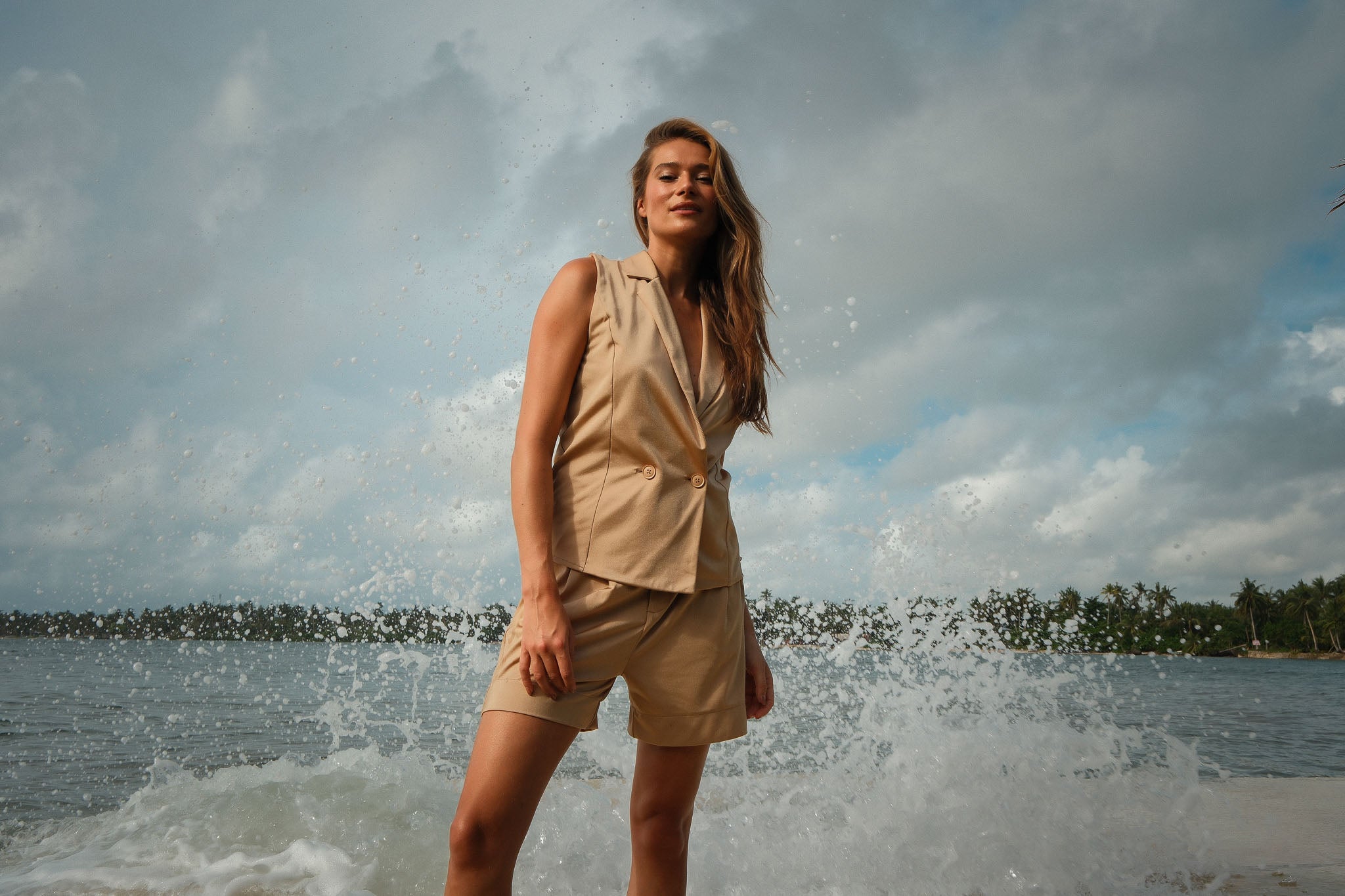 Model Renée is 1.69 m, draagt normaal maat XS/S en draagt hier maat S van Kimara. De short valt op maat en voelt heerlijk licht aan op de huid.