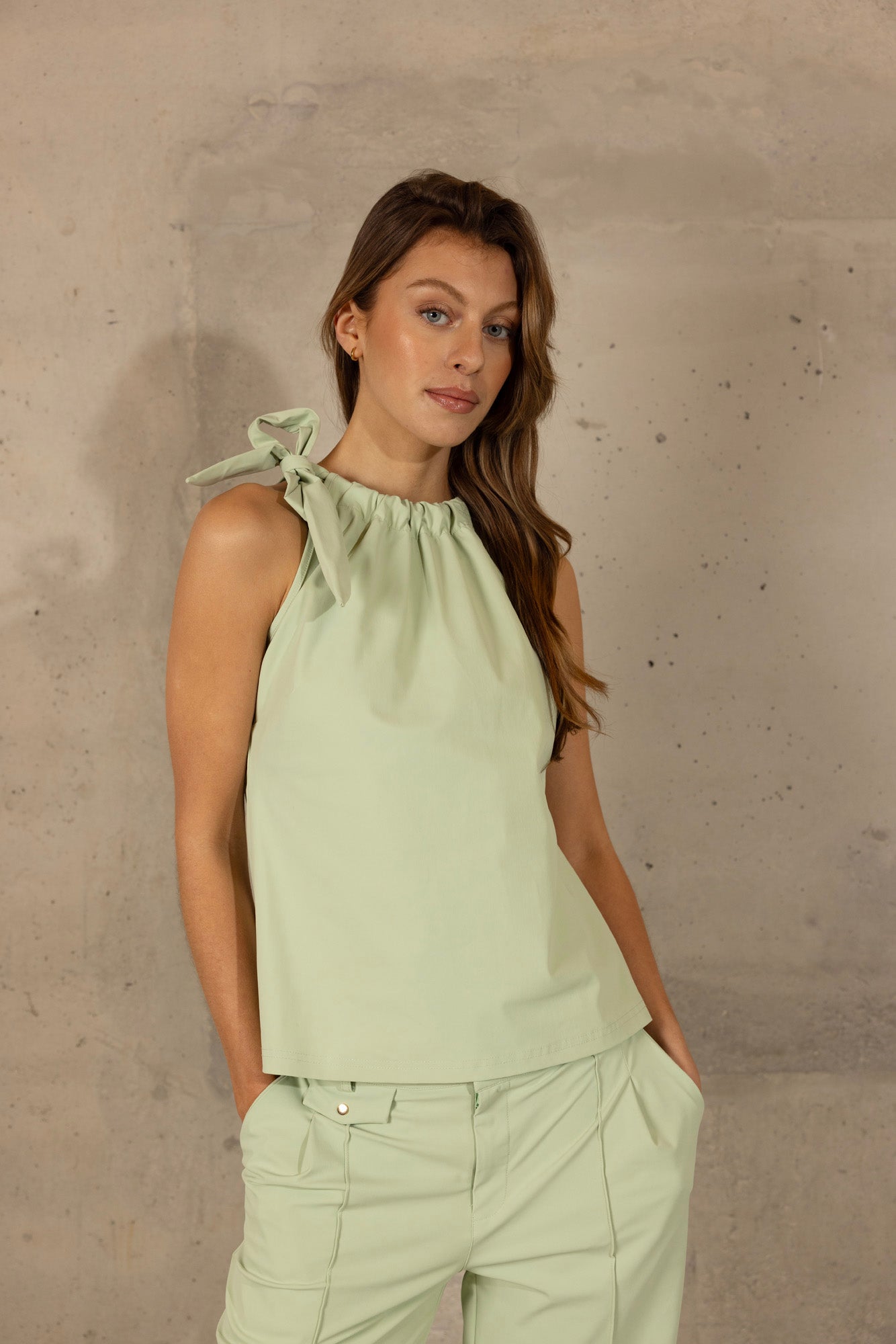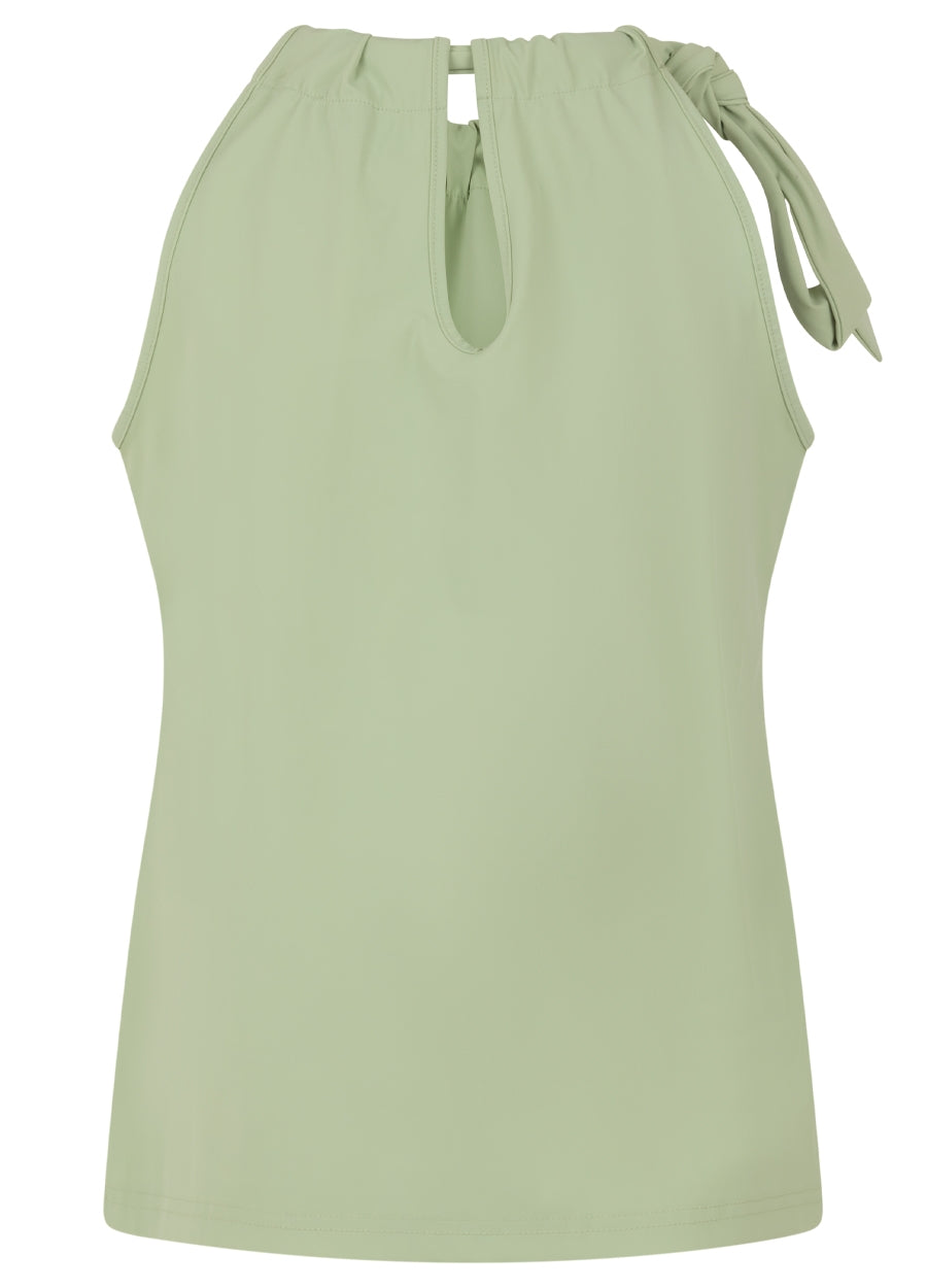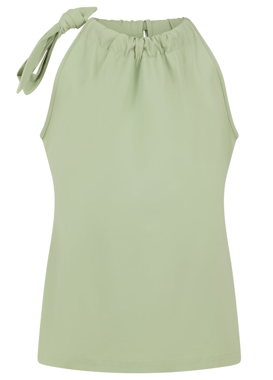 Ontdek de verfijning van de Rhode Top, een elegant kledingstuk gemaakt van hoogwaardige travelstof. Deze mouwloze top heeft een hoge halslijn met geplooide details en een strik op één schouder, wat een vleugje elegantie toevoegt aan het ontwerp. Verkrijgbaar in de prachtige kleuren Jade en Salt, biedt de Rhode Top een veelzijdige en stijlvolle optie voor elke garderobe.
