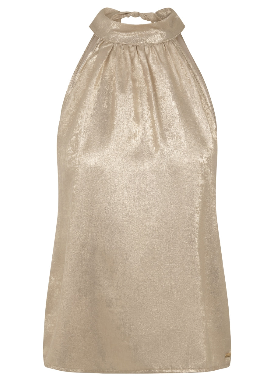 Ontdek de elegante Vivian Top, gemaakt van glanzende stof. Deze mouwloze top heeft een hoge hals en een losse pasvorm, wat zorgt voor een moderne en verfijnde uitstraling. De achterkant van de top heeft een halterstijl met een strik bij de nek, wat een extra vleugje elegantie toevoegt. De glanzende stof biedt een vleugje glamour, perfect voor zowel casual als feestelijke gelegenheden. De Vivian Top is verkrijgbaar in de kleuren Sky Blue en Sand. Combineer deze top met een van onze stijlvolle broeken of rokken voor een complete en modieuze look.